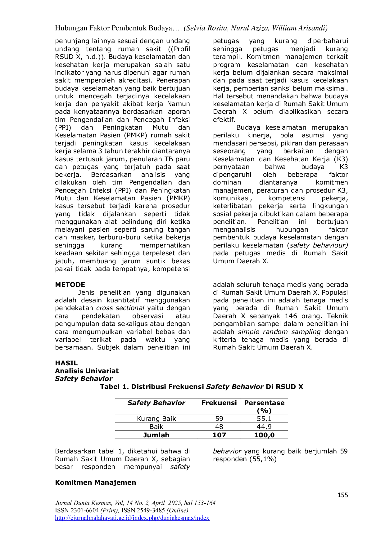 Jurnal Dunia KesmasJurnal Dunia KesmasBudaya keselamatan dapat terbentuk dengan adanya faktor pembentuk budaya keselamatan. Berdasarkan hasil pra-survey di RSUD X, terjadi peningkatan kasus kecelakaan kerja selama 3 tahun terakhir. Analisis menunjukkan bahwa kasus tersebut terjadi karena prosedur yang tidak dijalankan, seperti tidak menggunakan alat pelindung diri, terburu-buru saat bekerja, dan membuang jarum suntik bekas pakai tidak pada tempatnya. Penelitian ini bertujuan untuk melihat hubungan antara faktor pembentuk budaya keselamatan terhadap safety behavior. Jenis penelitian adalah kuantitatif dengan desain cross-sectional. Populasi penelitian berjumlah 146 dengan total sampel 107 responden yang diperoleh menggunakan teknik simple random sampling. Analisis data terdiri dari univariate dan bivariate menggunakan uji chi-square. Hasil menunjukkan bahwa terdapat hubungan antara komitmen manajemen, peraturan dan prosedur, keterlibatan pekerja dalam K3, kompetensi, dan lingkungan sosial pekerja terhadap safety behavior. Tidak terdapat hubungan antara komunikasi terhadap safety behavior.