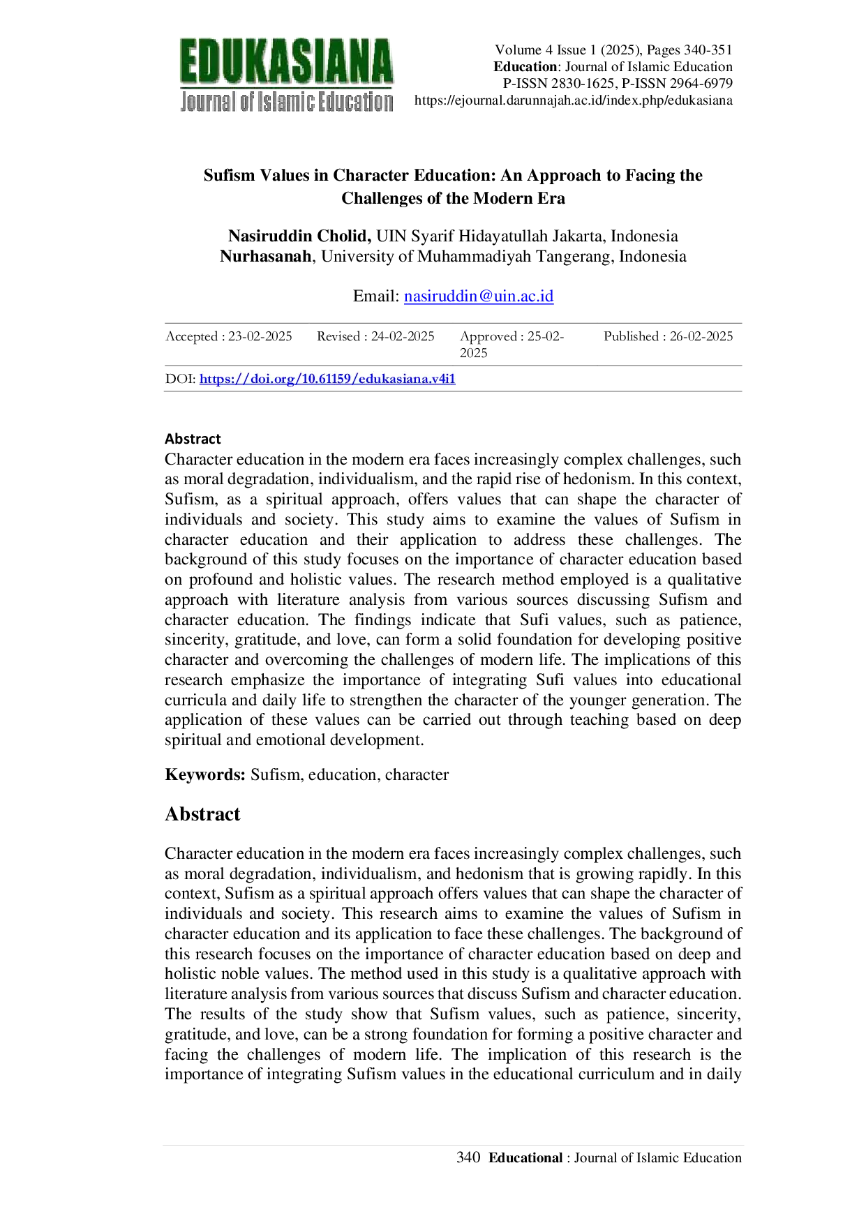 Penelitian ini menegaskan relevansi nilai-nilai sufisme dalam pendidikan karakter, terutama dalam menghadapi tantangan moral dan sosial masa kini.Nilai kesabaran, ketulusan, rasa syukur, dan cinta yang terkandung dalam ajaran sufisme dapat menumbuhkan karakter yang bermoral tinggi.Implementasi nilai-nilai ini dalam sistem pendidikan formal maupun nonformal sangat penting untuk mencetak generasi muda yang matang, bertanggung jawab, dan toleran terhadap perbedaan.
