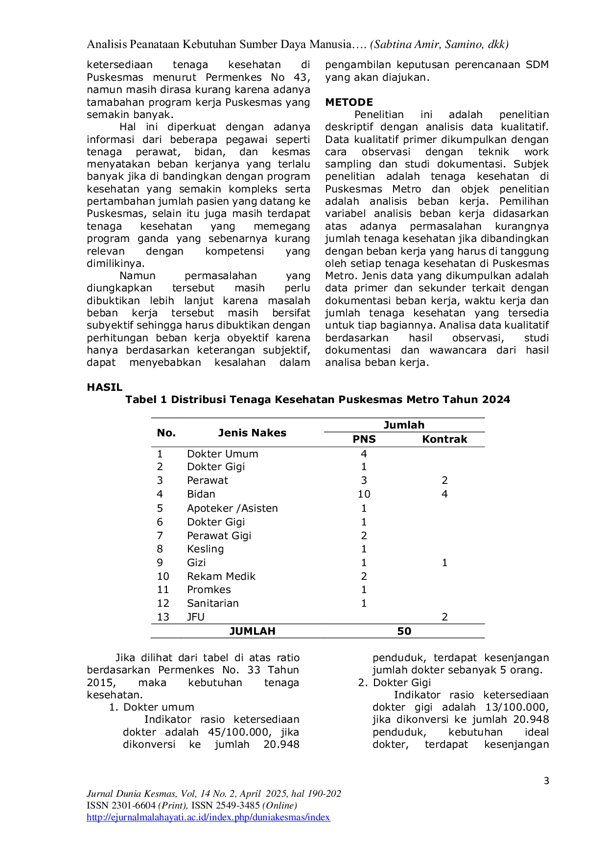 Hasil analisis menunjukkan bahwa rasio ketersediaan SDM Kesehatan di Puskesmas Metro belum ideal jika dibandingkan dengan jumlah penduduk di wilayah kerja.Terdapat kesenjangan antara ketersediaan dan kebutuhan tenaga kesehatan, dengan kesenjangan tertinggi pada tenaga bidan, perawat, dan dokter.Berdasarkan hasil wawancara, pelaksanaan analisis beban kerja belum sepenuhnya optimal dan terdapat hambatan dalam pengajuan usulan penambahan tenaga kesehatan.