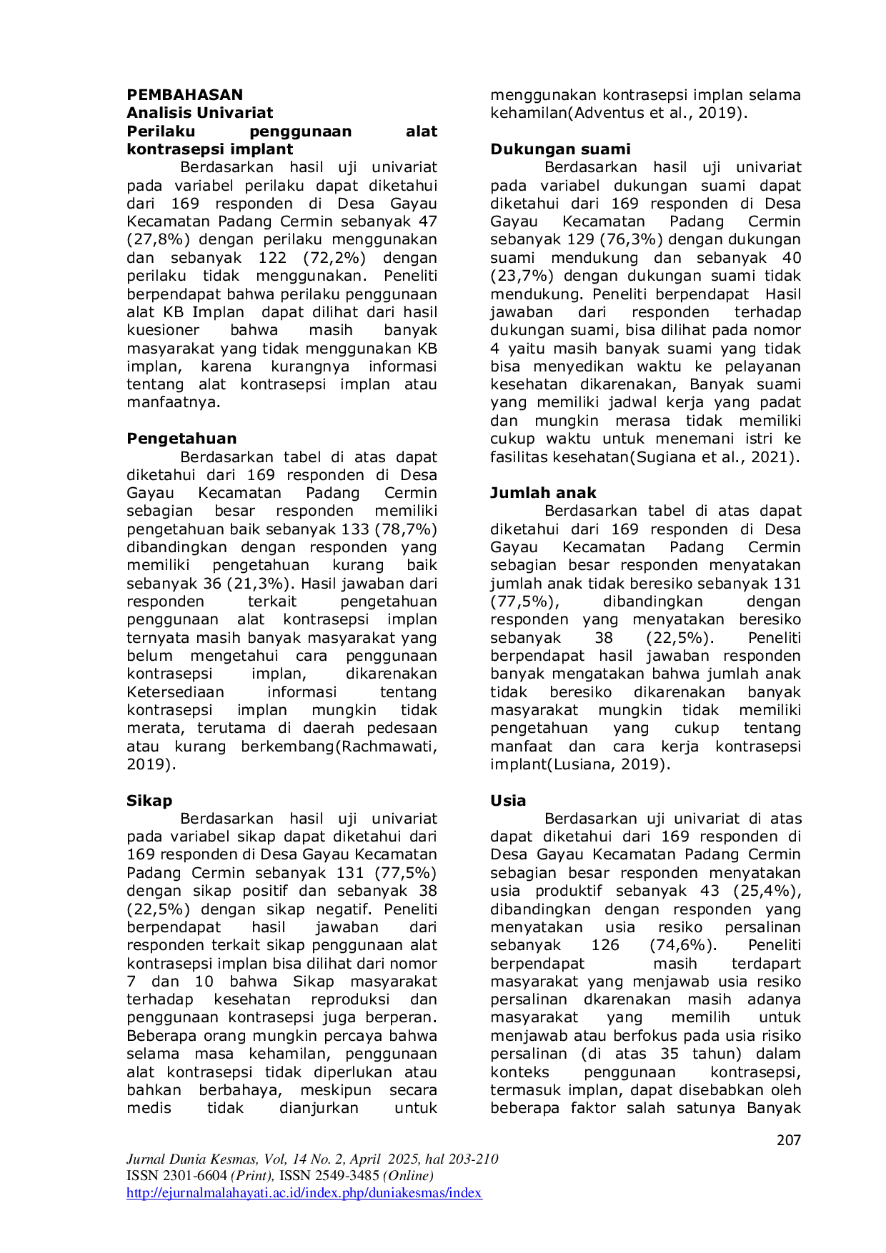 Jurnal Dunia KesmasJurnal Dunia KesmasImplan merupakan batang plastik kecil yang lentur, seukuran batang korek api. Hasil Pendataan Keluarga di Indonesia 2022, terdapat 59,4% akseptor menggunakan alat kontrasepsi modern. Menurut Badan Pusat Statistik Provinsi Lampung tahun 2018 sebanyak 280.188 pengguna KB aktif. Pengguna implan di kabupaten Pesawaran tahun 2023 sebanyak 1.260 pengguna KB aktif. Jumlah penggunan KB aktif di Desa Gayau sebanyak 85 orang. Tujuan penelitian ini untuk diketahui hubungan pengetahuan, sikap, dukungan suami, jumlah anak, usia, dan pendidikan dengan penggunaan alat kontrasepsi implan pada Pasangan Usia Subur di Desa Gayau Kecamatan Padang Cermin tahun 2024. Penelitian ini menggunakan desain penelitian kuantitatif dengan pendekatan cross sectional. Populasi dari penelitian ini yakni 292 KK dengan sampel sebanyak 169 PUS. Teknik pengumpulan data melalui kuesioner. Analisis data menggunakan univariat dan bivariat. Hasil penelitian diketahui bahwa ada perbedaan pengetahuan (p-value = 0,000), sikap (p-value = 0,001), dukungan suami (p-value = 0,000), jumlah anak (p-value = 0,001), usia (p-value = 0,000), pendidikan (p-value = 0,001) dengan perilaku penggunaan alat KB implan pada PUS.