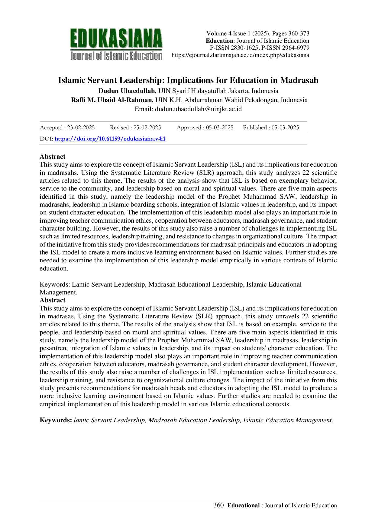 Edukasiana: Journal of Islamic EducationEdukasiana: Journal of Islamic EducationPenelitian ini bertujuan untuk mengeksplorasi konsep Kepemimpinan Pelayan Islam (ISL) dan implikasinya terhadap pendidikan di madrasah. Menggunakan pendekatan Systematic Literature Review (SLR), penelitian ini menganalisis 22 artikel ilmiah terkait tema ini. Hasil analisis menunjukkan bahwa ISL didasarkan pada perilaku teladan, pelayanan kepada masyarakat, dan kepemimpinan berdasarkan nilai-nilai moral dan spiritual. Terdapat lima aspek utama yang teridentifikasi dalam penelitian ini, yaitu model kepemimpinan Nabi Muhammad SAW, kepemimpinan di madrasah, kepemimpinan di pondok pesantren, integrasi nilai-nilai Islam dalam kepemimpinan, dan dampaknya terhadap pendidikan karakter siswa. Implementasi model kepemimpinan ini juga memainkan peran penting dalam meningkatkan etika komunikasi guru, kerja sama antar pendidik, tata kelola madrasah, dan pembentukan karakter siswa. Namun, hasil penelitian ini juga memunculkan sejumlah tantangan dalam implementasi ISL seperti keterbatasan sumber daya, pelatihan kepemimpinan, dan resistensi terhadap perubahan budaya organisasi. Dampak dari inisiatif penelitian ini memberikan rekomendasi bagi kepala madrasah dan pendidik dalam mengadopsi model ISL untuk menciptakan lingkungan belajar yang lebih inklusif berdasarkan nilai-nilai Islam. Penelitian lebih lanjut diperlukan untuk menguji implementasi model kepemimpinan ini secara empiris dalam berbagai konteks pendidikan Islam.