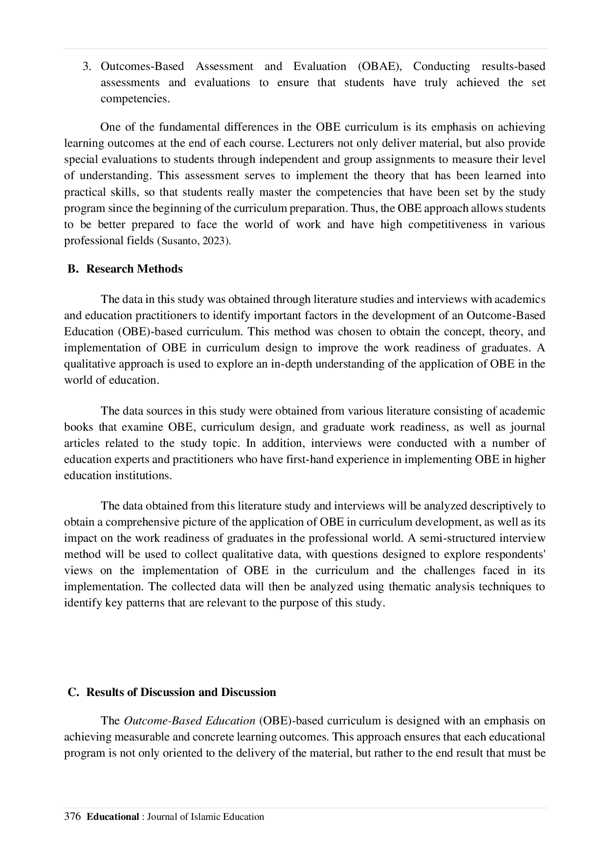 Edukasiana: Journal of Islamic EducationEdukasiana: Journal of Islamic EducationStudi ini mengeksplorasi bagaimana desain kurikulum Pendidikan Berbasis Hasil (OBE) dapat membantu mempersiapkan lulusan untuk memasuki dunia kerja. Pendekatan kualitatif digunakan untuk mendapatkan pemahaman mendalam tentang bagaimana prinsip-prinsip OBE diterapkan dalam pendidikan tinggi dan bagaimana mereka berkontribusi untuk meningkatkan kompetensi lulusan sejalan dengan kebutuhan industri. Studi ini menggunakan metode kualitatif dengan data yang diperoleh melalui tinjauan pustaka dan wawancara dengan akademisi dan praktisi pendidikan untuk mengidentifikasi faktor-faktor kunci dalam mengembangkan kurikulum berbasis OBE. Hasil penelitian menunjukkan bahwa OBE menekankan pencapaian hasil belajar yang terukur yang relevan dengan pasar kerja melalui perumusan tujuan pembelajaran yang jelas, penggunaan metode pengajaran yang berfokus pada pengembangan keterampilan, dan penilaian berbasis hasil yang mengevaluasi kesiapan lulusan. Dengan mengimplementasikan kurikulum berbasis OBE, lembaga pendidikan dapat lebih efektif membekali siswa dengan keterampilan dan pengetahuan yang dibutuhkan oleh industri, sehingga meningkatkan peluang mereka untuk mendapatkan pekerjaan yang sesuai dengan keahlian mereka.