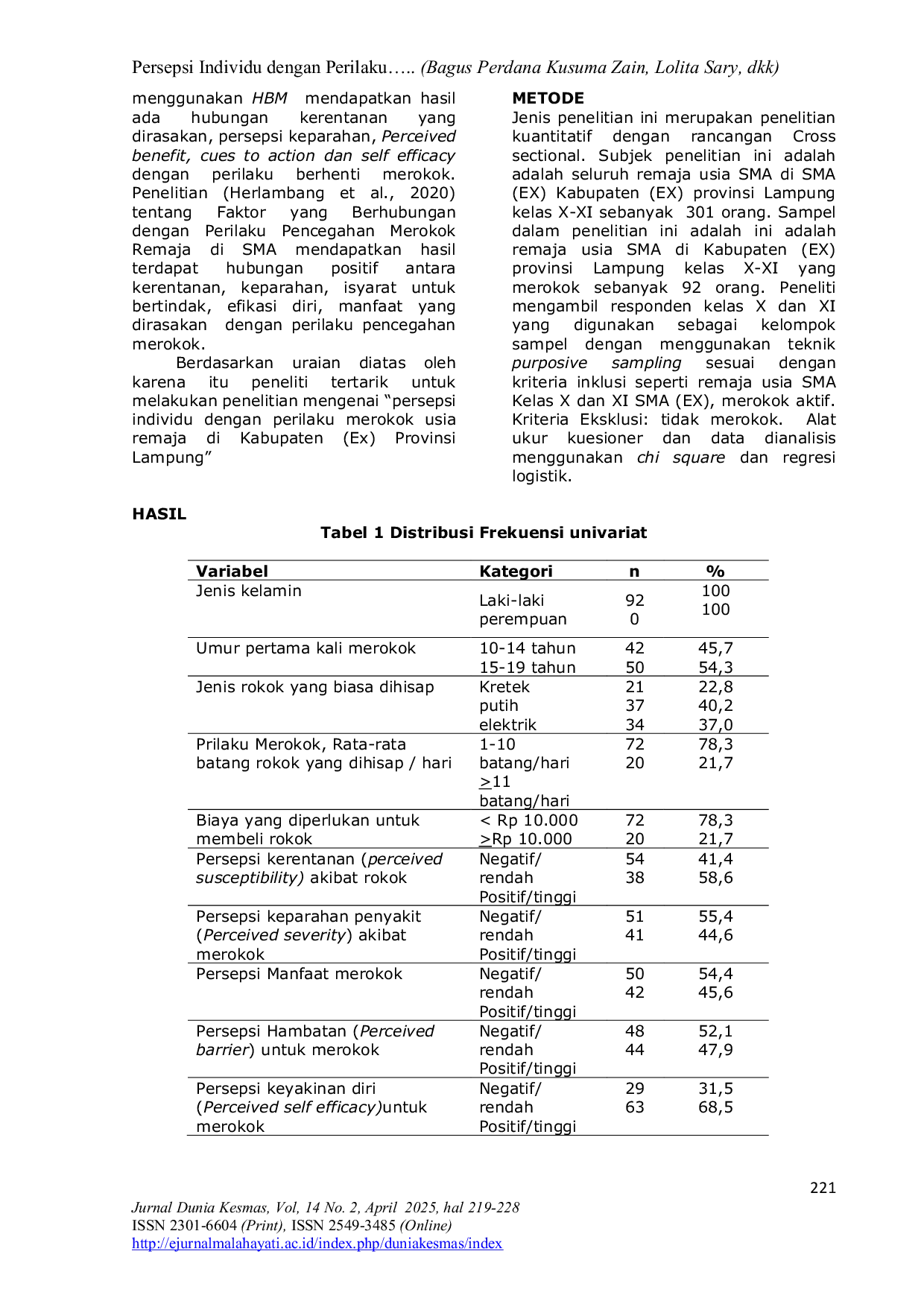 Jurnal Dunia KesmasJurnal Dunia KesmasTerjadi peningkatan jumlah batang rokok yang dihisap per hari pada penduduk Indonesia usia 10-18 tahun dari semula 8,6 batang per hari menjadi 8,7 batang. Tujuan dari penelitian ini adalah diketahuinya persepsi individu dengan perilaku merokok remaja usia SMA di Kabupaten (EX) di Provinsi Lampung. Jenis penelitian kuantitatif dengan rancangan potong lintang. Populasi remaja usia SMA di SMA (EX) Kabupaten (EX) provinsi Lampung kelas X-XI sebanyak 301 siswa. Sampel penelitian sebanyak 92 siswa Kelas X dan XI SMA (EX). Sampel diambil dengan metode purposive sampling, alat ukur kuesioner dan data dianalisis menggunakan chi square dan regresi logistik. Hasil penelitian didapatkan bahwa terdapat hubungan persepsi kerentanan (p value=0,09 OR=0,84), keparahan penyakit (p value=0,019 OR=8,419), persepsi hambatan (p value=0,003 OR=14.059), persepsi keyakinan diri (p value=0,005 OR=5.825) dengan perilaku merokok. Tidak terdapat hubungan manfaat (p value=0.538). Hendaknya Sekolah bersama dengan puskesmas melakukan skrining menggunakan CO detector. Meningkatkan Implementasi Kawasan Tanpa Rokok (KTR), konseling upaya berhenti merokok kepada perokok aktif dan menambah kegiatan ekstrakulikuler siswa. Edukasi kepada Komite Sekolah agar orangtua siswa memberikan uang saku secukupnya sebagai penghambat perilaku merokok siswa.