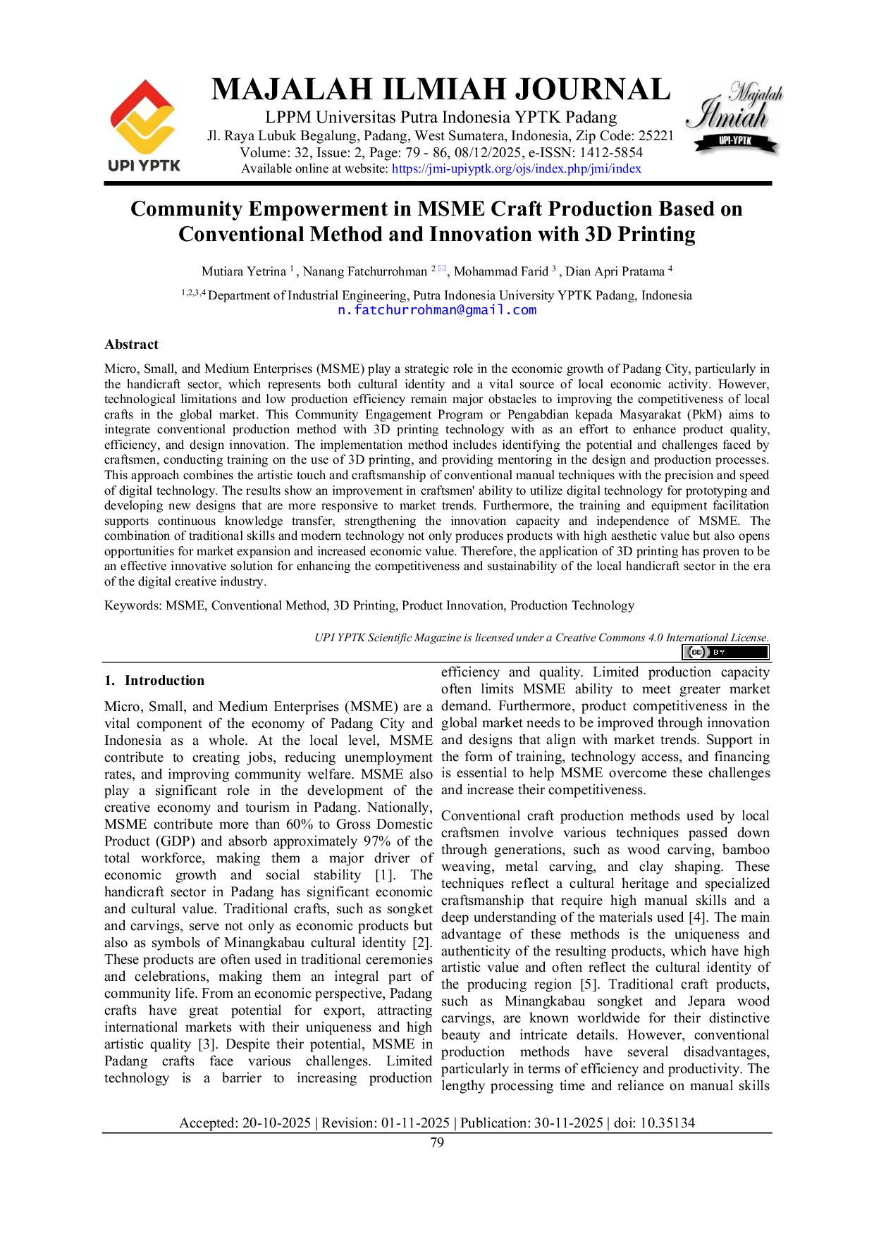 Majalah Ilmiah UPI YPTKMajalah Ilmiah UPI YPTKMicro, Small, and Medium Enterprises (MSME) play a strategic role in the economic growth of Padang City, particularly in the handicraft sector, which represents both cultural identity and a vital source of local economic activity. However, technological limitations and low production efficiency remain major obstacles to improving the competitiveness of local crafts in the global market. This Community Engagement Program aims to integrate conventional production method with 3D printing technology as an effort to enhance product quality, efficiency, and design innovation. The implementation method includes identifying the potential and challenges faced by craftsmen, conducting training on the use of 3D printing, and providing mentoring in the design and production processes. This approach combines the artistic touch and craftsmanship of conventional manual techniques with the precision and speed of digital technology. The results show an improvement in craftsmen ability to utilize digital technology for prototyping and developing new designs that are more responsive to market trends. Furthermore, the training and equipment facilitation supports continuous knowledge transfer, strengthening the innovation capacity and independence of MSME. The combination of traditional skills and modern technology not only produces products with high aesthetic value but also opens opportunities for market expansion and increased economic value. Therefore, the application of 3D printing has proven to be an effective innovative solution for enhancing the competitiveness and sustainability of the local handicraft sector in the era of the digital creative industry.