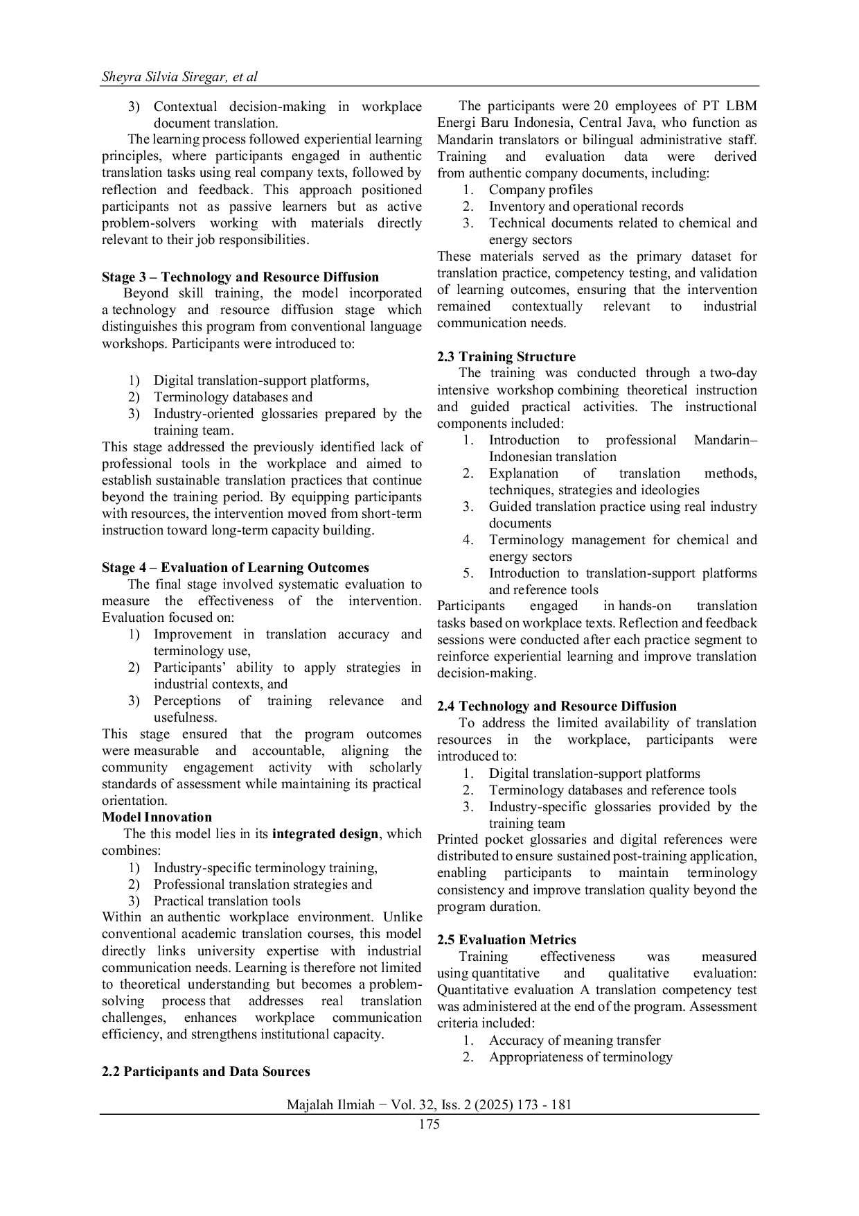 The community engagement program effectively enhanced Mandarin–Indonesian translation competence in an industrial setting, as evidenced by improved translation performance and positive participant evaluations.The program addressed key challenges related to translation accuracy, professional strategy mastery, and terminology resources.By integrating needs analysis, contextualized training, and technology diffusion, the program bridged the gap between academic preparation and real-world workplace demands.