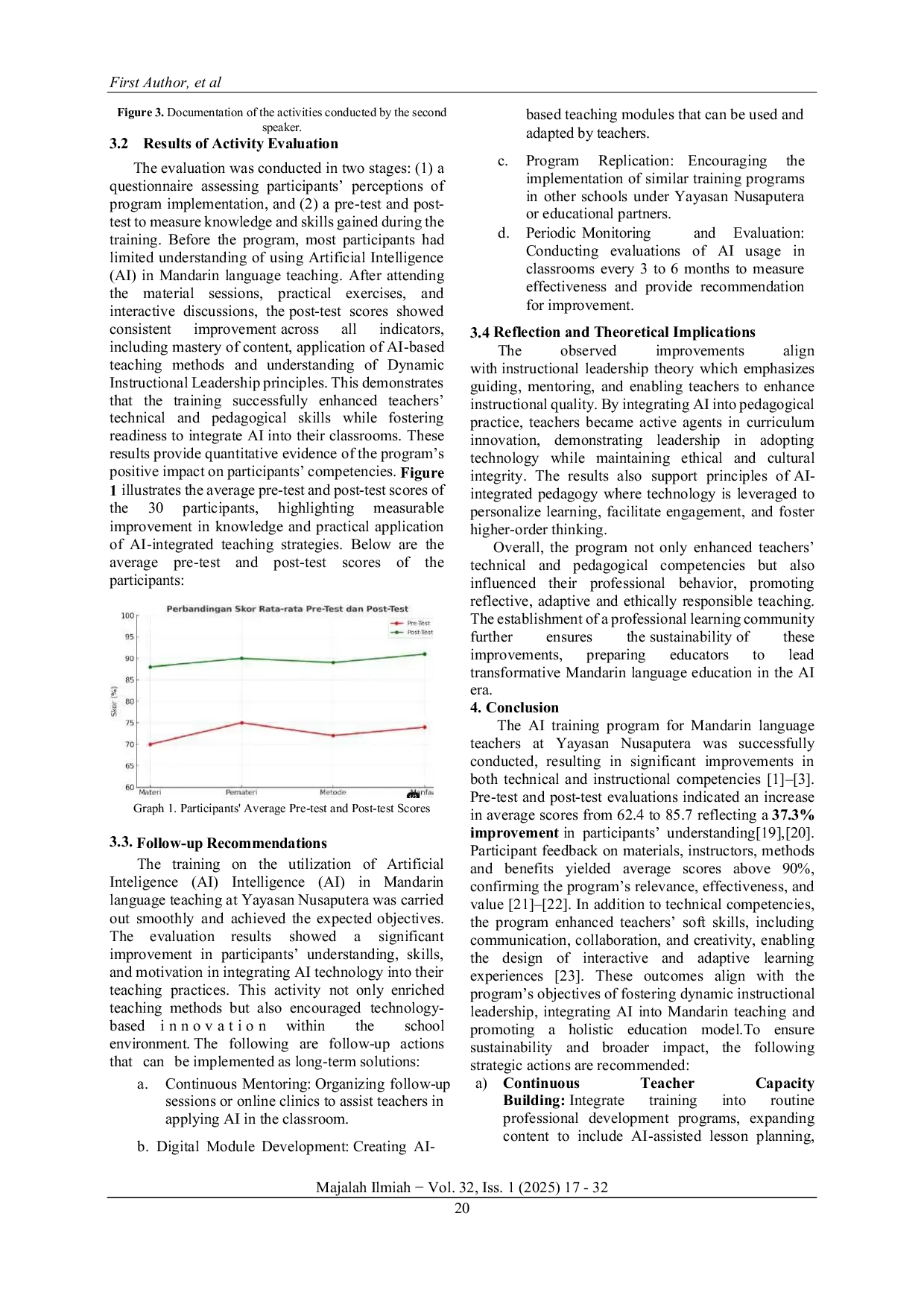 Majalah Ilmiah UPI YPTKMajalah Ilmiah UPI YPTKThis community service initiative aimed to strengthen instructional leadership among Mandarin language teachers in addressing the challenges of the Artificial Intelligence (AI) era. Guided by a holistic education framework integrating technical knowledge, social wisdom, and ethical values, the program focused on enhancing teachers digital literacy, pedagogical innovation and ethical awareness in technology-assisted instruction. Implemented through a participatory approach, the activities included four key stages: needs assessment, training, mentoring and evaluation. Teachers actively collaborated to identify learning challenges and design AI-based teaching practices grounded in cultural and moral responsibility. The results revealed substantial improvement in teachers ability to develop creative, AI-supported Mandarin learning materials and to apply digital tools with cultural sensitivity. Participants also reported higher confidence and leadership capacity in managing AI-integrated classrooms. Furthermore, the initiative successfully established a sustainable professional learning network that fosters collaboration and continuous professional growth among educators. Overall, this program contributed significantly to improving teacher competence, promoting ethical and innovative pedagogy and preparing Mandarin language educators to become adaptive, responsible and culturally aware leaders in the age of artificial intelligence.