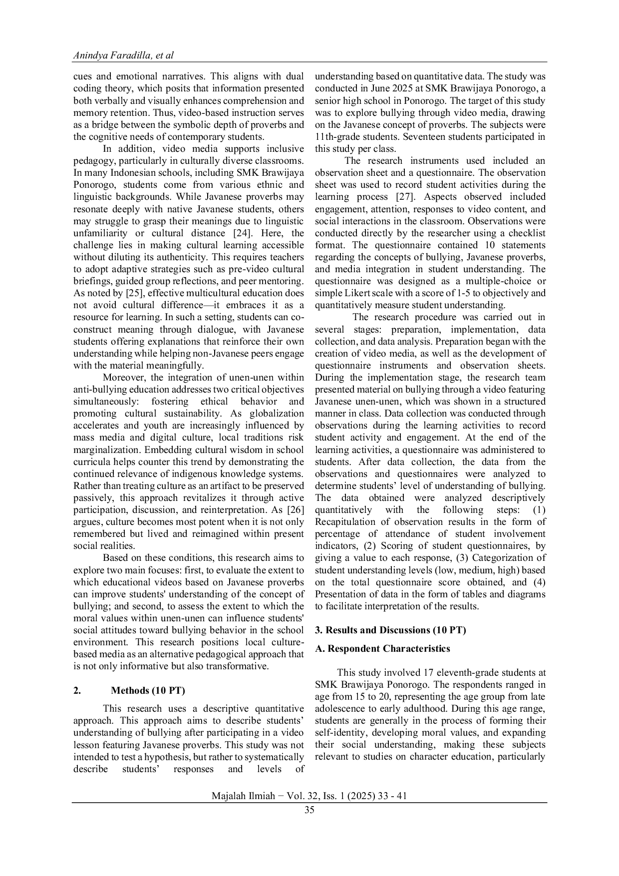 Majalah Ilmiah UPI YPTKMajalah Ilmiah UPI YPTKBullying tetap menjadi masalah yang meluas di sekolah, yang berdampak pada prestasi akademik, kesejahteraan emosional, dan perkembangan sosial siswa. Penelitian ini mengeksplorasi integrasi peribahasa Jawa (unen-unen) melalui media video sebagai pendekatan kontekstual terhadap pendidikan anti-bullying di SMK Brawijaya Ponorogo. Dengan menggunakan metode deskriptif kuantitatif, penelitian melibatkan 17 siswa kelas XI dan menggunakan lembar observasi serta kuesioner untuk menilai pemahaman mereka tentang konsep bullying dan pengaruh peribahasa Jawa terhadap sikap sosial mereka. Temuan menunjukkan bahwa media video secara efektif meningkatkan pemahaman siswa tentang bullying, dengan skor rata-rata 4,35 untuk pemahaman definisi bullying dan 4,47 untuk mengenali bullying sebagai tindakan yang tidak pantas. Peribahasa Jawa mendorong sikap reflektif, dengan 64,8% siswa mempertimbangkan kembali perilaku mereka terhadap teman sebaya. Namun, tantangan muncul bagi siswa non-Jawa karena kurangnya familiaritas dengan konteks budaya, yang memerlukan strategi adaptif seperti diskusi kelompok untuk menjembatani kesenjangan pemahaman. Pendekatan ini tidak hanya meningkatkan kesadaran moral dan penolakan bullying, tetapi juga mempromosikan pelestarian budaya dan dialog inklusif. Penelitian ini menekankan potensi pendidikan berbasis kebijaksanaan lokal dalam menciptakan pengalaman belajar transformatif dan relevan secara budaya untuk mengatasi masalah sosial di berbagai lingkungan sekolah.