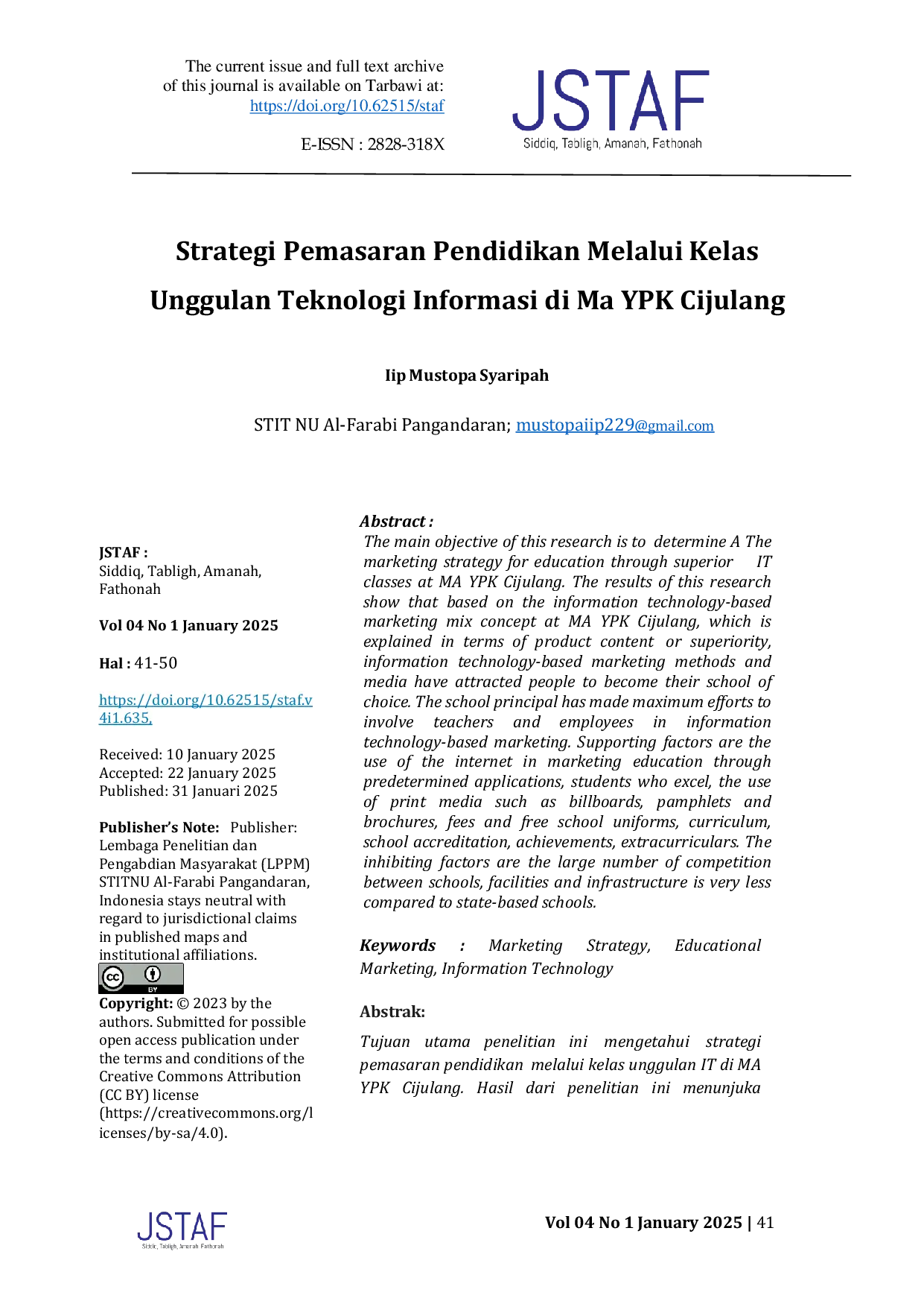J-STAF: Siddiq, Tabligh, Amanah, FathonahJ-STAF: Siddiq, Tabligh, Amanah, FathonahTujuan utama penelitian ini adalah untuk mengetahui strategi pemasaran pendidikan melalui kelas unggulan IT di MA YPK Cijulang. Hasil penelitian menunjukkan bahwa berdasarkan konsep bauran pemasaran berbasis teknologi informasi di MA YPK Cijulang, metode dan media pemasaran berbasis teknologi informasi telah memberi daya tarik bagi masyarakat untuk menjadi pilihan sekolah. Pelibatan guru dan karyawan dalam pemasaran berbasis teknologi informasi telah diupayakan maksimal oleh kepala sekolah. Faktor pendukung adalah pemanfaatan internet dalam pemasaran Pendidikan melalui aplikasi yang sudah ditentukan, siswa siswi yang berprestasi, pemanfaatan adanya media cetak seperti baleho, pamphlet, dan brosur, biaya dan baju seragam sekolah gratis, kurikulum, akreditasi sekolah, prestasi, dan ekstrakulikuler. Faktor penghambat adalah banyaknya persaingan antara sekolah, sarana dan prasarana sangat kurang dibandingkan sekolah yang berbasis negeri.