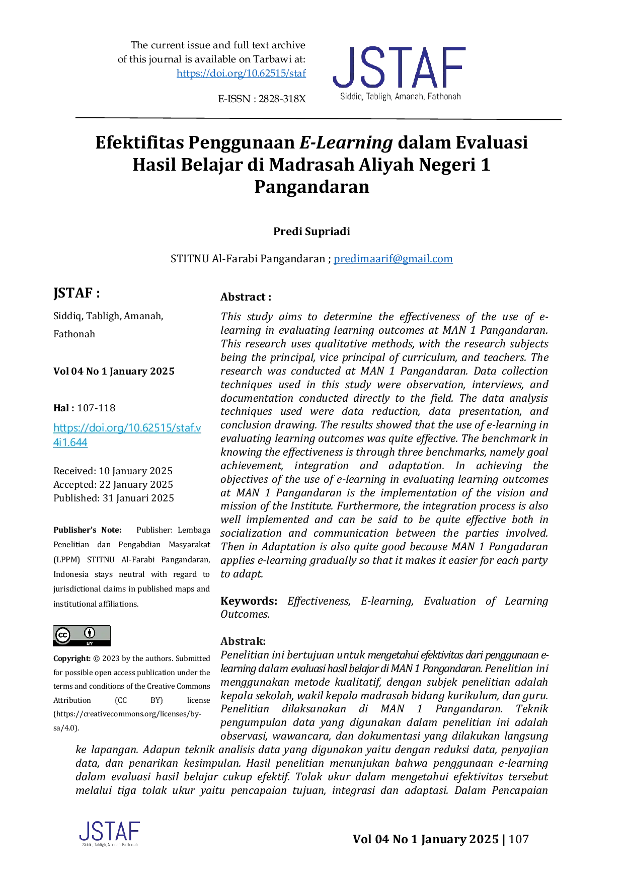 - Efektifitas Penggunaan E-Learning dalam Evaluasi Hasil Belajar di Madrasah Aliyah Negeri 1 Pangandaran... doi.org/10.62515/staf.v4i1.644Efektifitas Penggunaan E Learning dalam Evaluasi Hasil Belajar di Madrasah Aliyah Negeri 1 Pangandaran doi 10 62515 staf v4i1 644