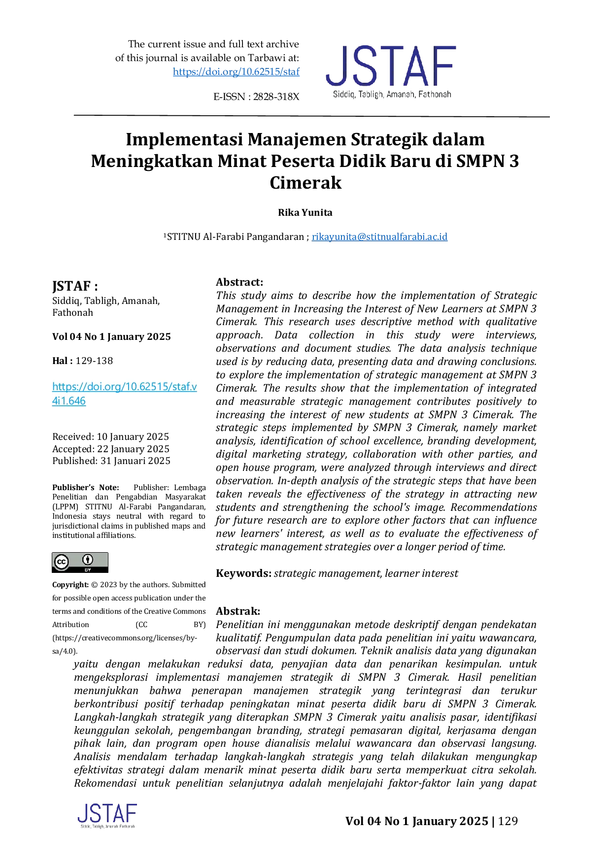 - Implementasi Manajemen Strategik dalam Meningkatkan Minat Peserta Didik Baru di SMPN 3 Cimerak | J-STAF:... ejournal.alfarabi.ac.id/index.php/staf/article/view/646Implementasi Manajemen Strategik dalam Meningkatkan Minat Peserta Didik Baru di SMPN 3 Cimerak J STAF ejournal alfarabi ac index php staf article view 646