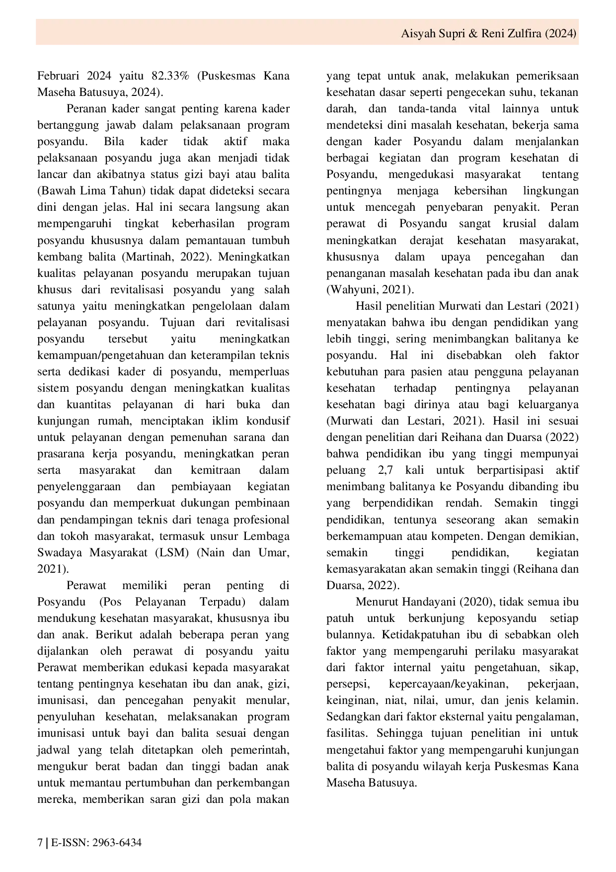 AACENDIKIA: Journal of NursingAACENDIKIA: Journal of NursingPendahuluan: Posyandu merupakan pelayanan yang diselenggarakan dari masyarakat oleh masyarakat dan untuk masyarakat sedangkan pemerintah hanya memfasilitasi. Tidak semua ibu patuh untuk berkunjung ke posyandu setiap bulannya. Ketidakpatuhan ibu disebabkan oleh faktor yang mempengaruhi perilaku masyarakat dari faktor internal yaitu pengetahuan, sikap, persepsi, kepercayaan/keyakinan, pekerjaan, keinginan, niat, nilai, umur, dan jenis kelamin. Sedangkan dari faktor eksternal yaitu pengalaman, fasilitas. Tujuan penelitian ini untuk mengetahui wilayah kerja Puskesmas Kana Maseha Batusuya.. Metode: Penelitian ini menggunakan desain analitik dengan pendekatan cross sectional. Populasi dalam penelitian ini adalah jumlah seluruh ibu yang memiliki balita 0-24 bulan priode Januari-Mei 2024 di posyandu wilayah kerja Puskesmas Kana Maseha Batusuya yang berjumlah 626 orang. Pengambilan sampel dilakukan dengan perhitungan rumus slovin, didapatkan 86 responden. Pengumpulan data dilakukan dengan menggunakan lembar kuesioner dan lembar observasi. Data yang telah dikumpulkan kemudian diolah dan dianalisis menggunakan program statistik SPSS versi 22 dan dianalisis dengan uji chi square.. Hasil: Penelitian menunjukkan bahwa ada pengaruh pendidikan, pekerjaan, pengetahuan, sikap ibu balita dan peran kader dengan kunjungan balita di posyandu wilayah kerja Puskesmas Kana Maseha Batusuya. Kelima variabel yang diteliti pendidikan (p=,000), pekerjaan (p=,002), pengetahuan (p=,000), sikap (p=,000) dan peran kader (p=,000).