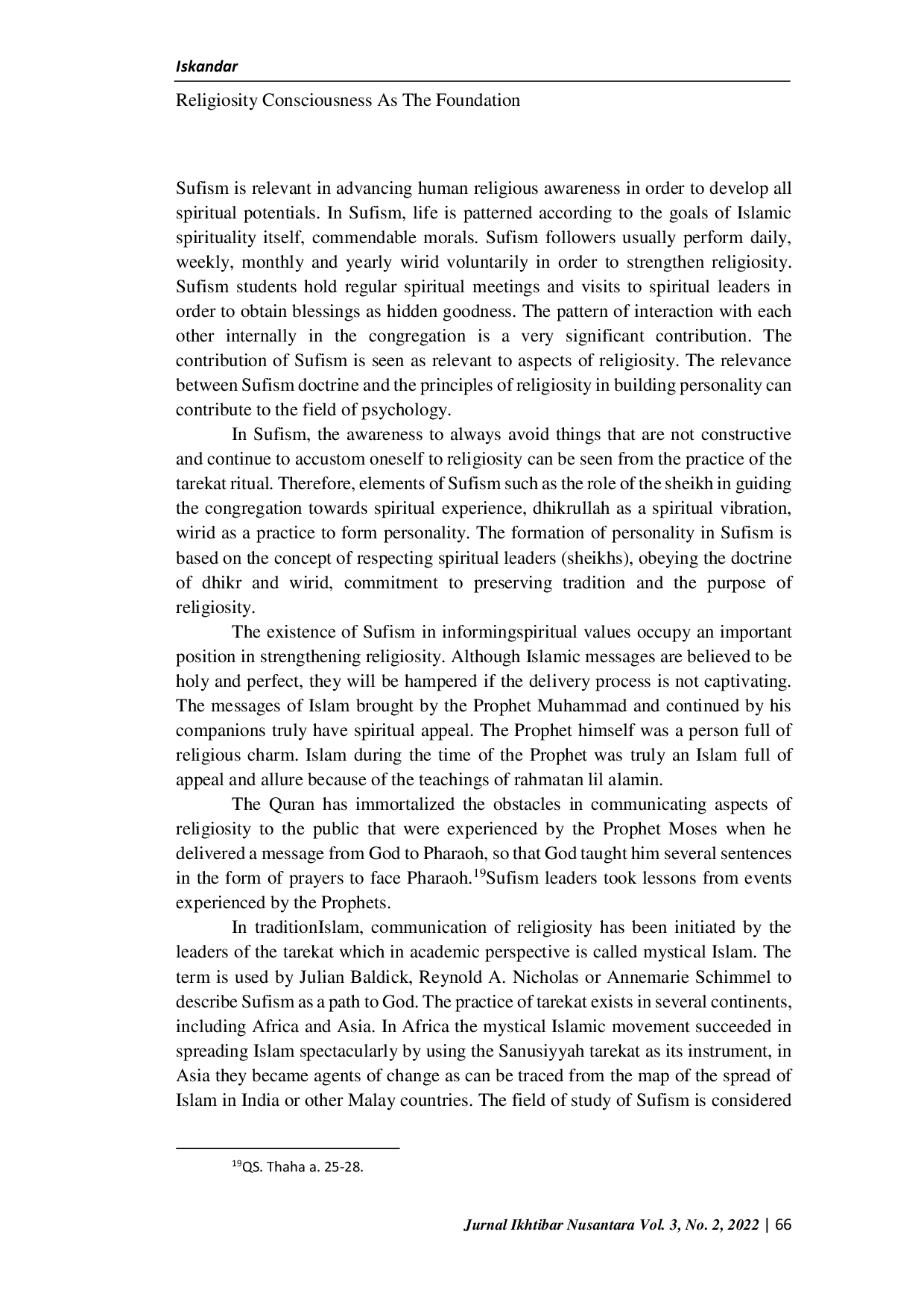 Jurnal Ikhtibar NusantaraJurnal Ikhtibar NusantaraKesadaran sebagai fungsi mental utama terus diteliti dalam kaitannya dengan religiusitas dalam pembentukan kepribadian. Religiusitas, dalam arti ketekunan dalam menjalankan praktik keagamaan dalam Islam, secara khusus dibahas dalam tasawuf sebagai disiplin spiritual. Makalah ini menghadirkan kesadaran beragama dalam membentuk kepribadian sehubungan dengan tasawuf. Dalam tasawuf, pembentukan kepribadian melibatkan tahapan takhalli (pelepasan sifat negatif), tahalli (pengisian sifat positif), dan tajalli (internalisasi sifat positif). Diskusi ini menggabungkan data kepustakaan dengan data lapangan dari praktisi tasawuf yang berafiliasi dengan tarekat Naqsyabandiyah di kawasan pesisir utara Aceh. Tasawuf di kalangan masyarakat Aceh, khususnya di wilayah pesisir utara, tetap menjadi rujukan utama dalam memahami dan memperkuat religiusitas, sebagaimana terbukti dari referensi keagamaan yang digunakan di pesantren (dayah) dan di kalangan pengikut tarekat. Referensi-referensi tersebut secara eksplisit menjelaskan relevansi dan pentingnya menjalankan syariat, tarekat, dan hakikat sebagai kesatuan yang tak terpisahkan. Tasawuf, melalui referensi dan praktik lapangannya, diketahui mampu meningkatkan kesadaran beragama dalam membentuk kepribadian Islami.
