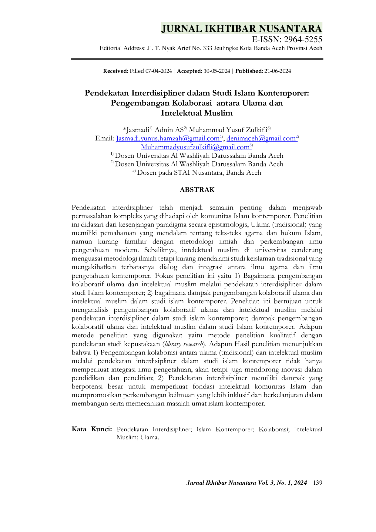 Jurnal Ikhtibar NusantaraJurnal Ikhtibar NusantaraPenelitian ini didasari dari kesenjangan paradigma secara epistimologis, Ulama (tradisional) yang memiliki pemahaman yang mendalam tentang teks-teks agama dan hukum Islam, namun kurang familiar dengan metodologi ilmu pengetahuan modern. Sebaliknya, intelektual muslim di universitas cenderung menguasai metodologi ilmiah tetapi kurang mendalami studi keislaman tradisional yang mengakibatkan terbatasnya dialog dan integrasi antara ilmu agama dan ilmu pengetahuan kontemporer. Penelitian ini bertujuan untuk menganalisis pengembangan kolaboratif ulama dan intelektual muslim melalui pendekatan interdisipliner dalam studi Islam kontemporer dan dampaknya. Metode penelitian yang digunakan adalah metode penelitian kualitatif dengan pendekatan studi kepustakaan. Hasil penelitian menunjukkan bahwa pengembangan kolaborasi antara ulama (tradisional) dan intelektual muslim melalui pendekatan interdisipliner dalam studi Islam kontemporer tidak hanya memperkuat integrasi ilmu pengetahuan, akan tetapi juga mendorong inovasi dalam pendidikan dan penelitian; pendekatan interdisipliner memiliki dampak yang berpotensi besar untuk memperkuat fondasi intelektual komunitas Islam dan mempromosikan perkembangan keilmuan yang lebih inklusif dan berkelanjutan dalam membangun serta memecahkan masalah umat islam kontemporer.