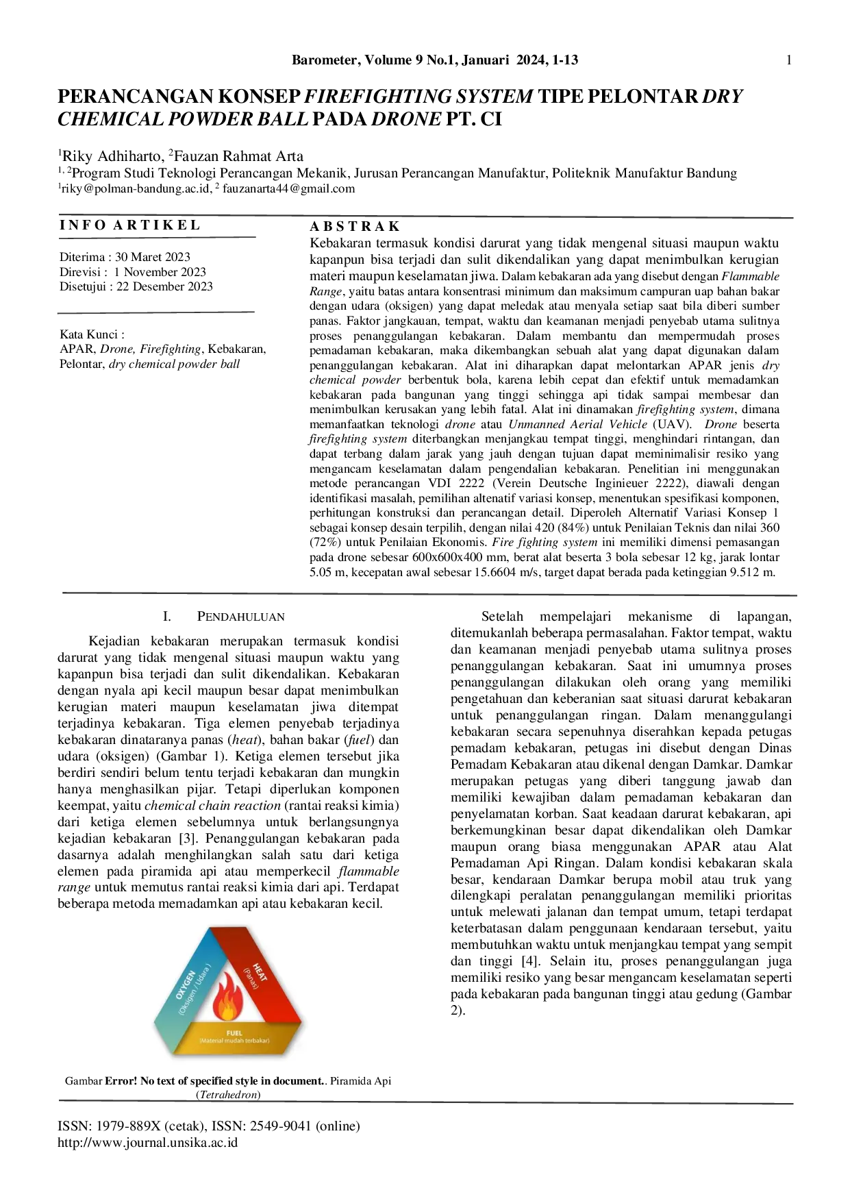 BAROMETERBAROMETERKebakaran merupakan kondisi darurat yang dapat menimbulkan kerugian materi dan jiwa. Faktor jangkauan, tempat, waktu, dan keamanan menjadi kendala utama dalam penanggulangan kebakaran. Penelitian ini mengembangkan alat yang dapat melontarkan APAR jenis dry chemical powder berbentuk bola menggunakan teknologi drone untuk memadamkan kebakaran pada bangunan tinggi secara cepat dan efektif, meminimalkan risiko keselamatan. Metode perancangan VDI 2222 digunakan, menghasilkan Alternatif Variasi Konsep 1 sebagai desain terpilih dengan nilai 420 (84%) untuk Penilaian Teknis dan 360 (72%) untuk Penilaian Ekonomis. Firefighting system ini memiliki dimensi 600x600x400 mm, berat 12 kg, jarak lontar 5.05 m, kecepatan awal 15.6604 m/s, dan target ketinggian 9.512 m.