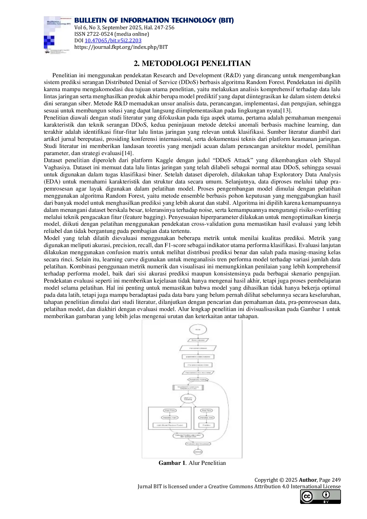 Bulletin of Information Technology (BIT)Bulletin of Information Technology (BIT)Serangan Distributed Denial of Service (DDoS) merupakan ancaman serius bagi keamanan jaringan, sementara metode deteksi tradisional seperti threshold-based detection dan signature-based detection memiliki keterbatasan dalam mengenali pola serangan baru maupun anomali lalu lintas yang kompleks. Penelitian ini bertujuan merancang dan mengimplementasikan model prediksi serangan DDoS berbasis algoritma Random Forest yang mampu membedakan trafik normal dan berindikasi serangan secara akurat. Pendekatan Research and Development (R&D) digunakan, meliputi studi literatur, perancangan model, implementasi, serta evaluasi performa menggunakan metrik akurasi, precision, recall, F1-score, confusion matrix, dan learning curve. Berdasarkan hasil evaluasi, model Random Forest menunjukkan kinerja sangat baik dengan akurasi 0,99942 (99,942%). Precision untuk kelas 0 dan 1 masing-masing sebesar 0,99979 dan 0,99884, sedangkan recall mencapai 0,99928 untuk kelas 0 dan 0,99966 untuk kelas 1. Nilai F1-score tinggi, yaitu 0,99953 untuk kelas 0 dan 0,99925 untuk kelas 1, dengan macro average F1-score sebesar 0,99939 dan weighted average sebesar 0,99942, menunjukkan keseimbangan performa pada kedua kelas. Confusion Matrix menunjukkan kesalahan klasifikasi rendah (44 false positive dan 13 false negative dari 99.066 sampel). Analisis learning curve mengungkapkan akurasi pelatihan stabil di atas 0,998, sedangkan akurasi validasi meningkat dari 0,986 pada 10.000 data hingga di atas 0,998 pada 80.000 data, dengan jarak antarkurva semakin kecil. Pola ini menandakan model mampu memanfaatkan data tambahan untuk meningkatkan generalisasi tanpa gejala overfitting atau underfitting. Temuan ini membuktikan bahwa model Random Forest yang dirancang dapat menjadi solusi deteksi dini serangan DDoS yang andal, adaptif, dan berpotensi diintegrasikan dalam sistem keamanan jaringan secara real-time.