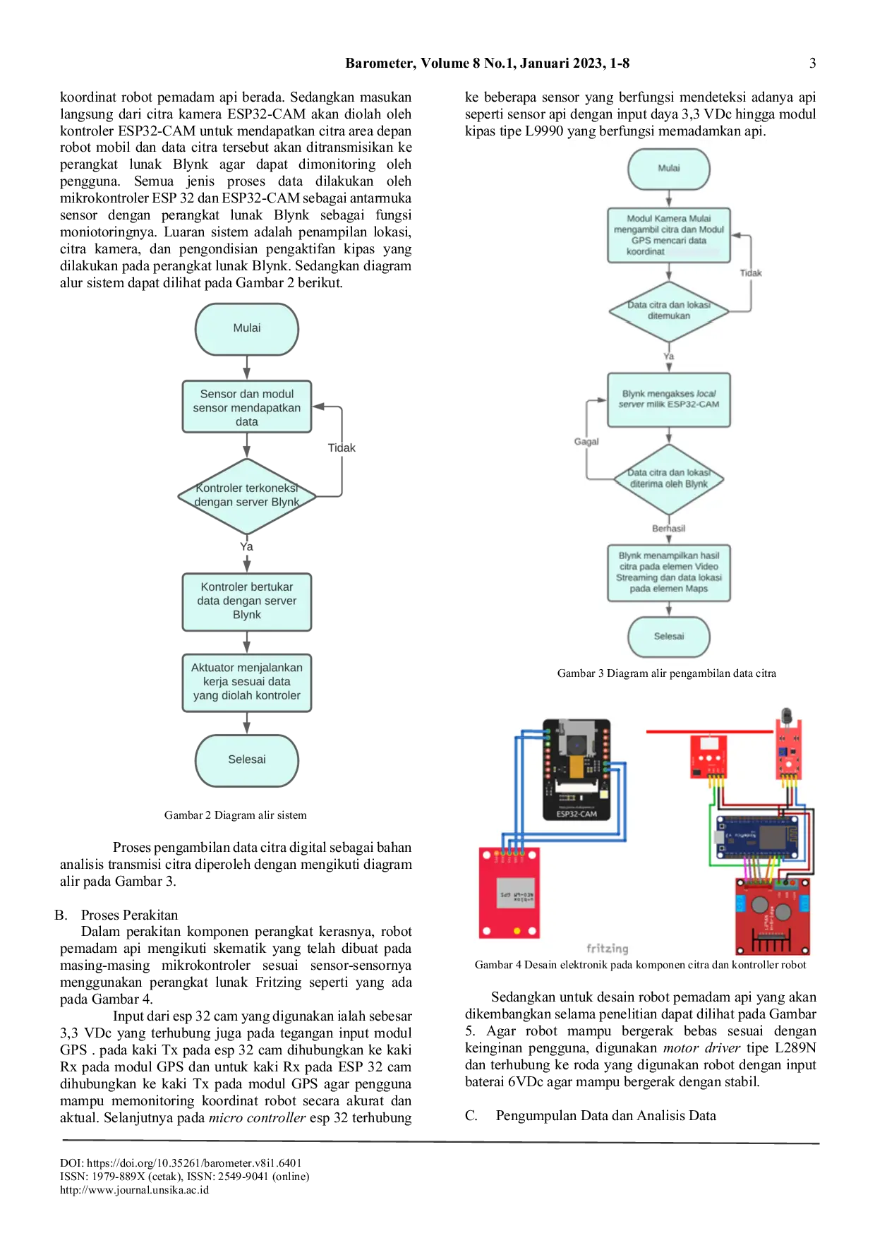 BAROMETERBAROMETERPenelitian ini mengusulkan desain dan prototipe robot pemadam api berbasis ESP32 cam dan implementasinya, dengan pembahasan konstruksi dan pengoperasiannya. Robot ini dapat dioperasikan dalam berbagai mode menggunakan remote control perangkat lunak Blynk dan teknologi GPS. Untuk deteksi dini api, dibutuhkan kualitas citra yang baik dan kecepatan transmisi data citra digital yang cepat. Monitoring dilakukan menggunakan ESP32 cam dengan kompresi MJPG, menghasilkan delay rata-rata 97 ms dengan kualitas kompresi citra di bawah 10 fps, serta mampu memadamkan api kecil dengan jarak maksimum rata-rata 15,25 cm pada baud rate 9600 bps. Pengujian mekanis menunjukkan robot mampu bergerak sesuai dengan joystick.