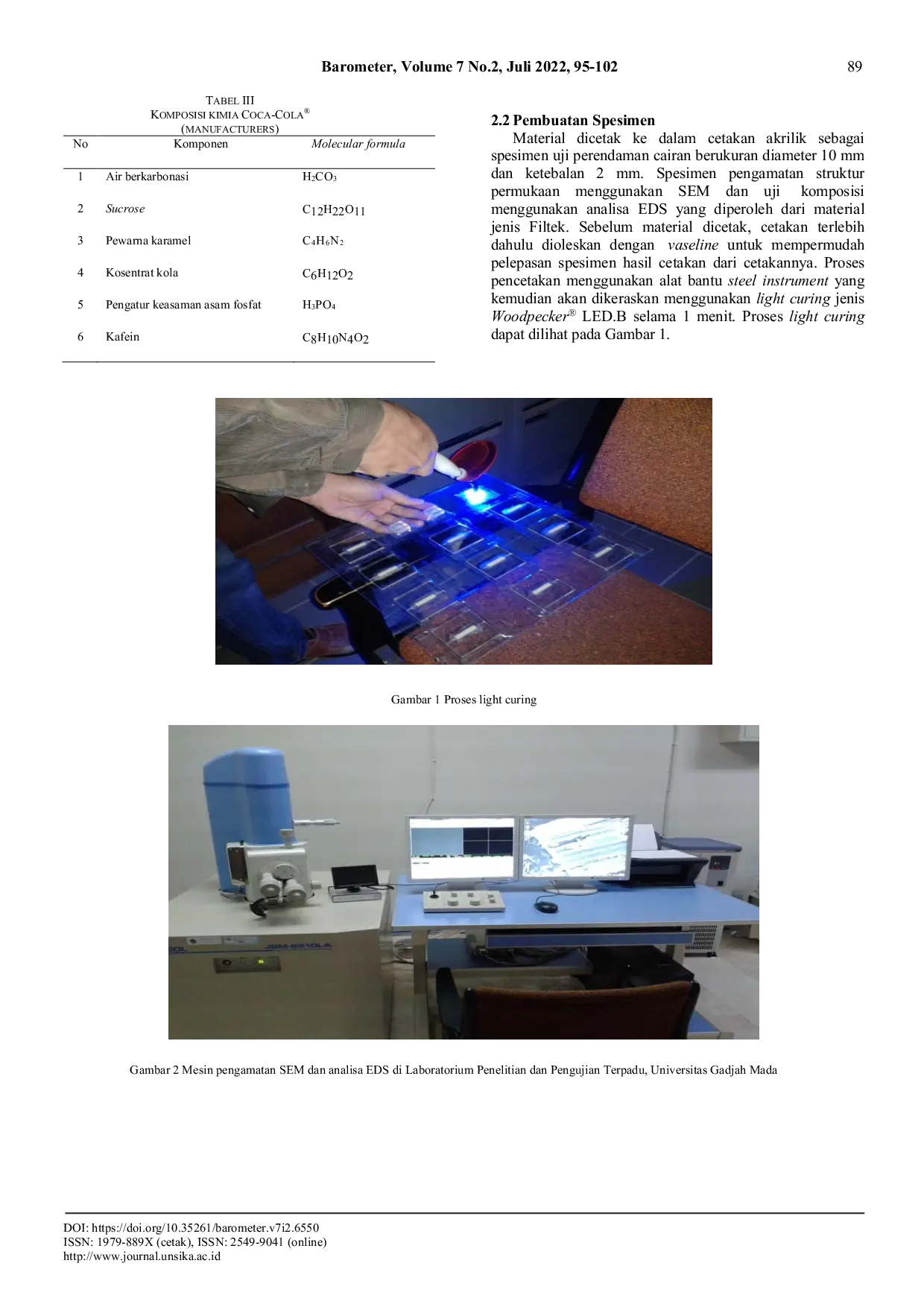 BAROMETERBAROMETERMaterial tambal gigi merupakan komposit yang tersusun dari matriks yang bersifat hidrofilik dan filler sebagai penguatnya. Cairan yang masuk ke dalam mulut dan melewati bahan tambal gigi akan masuk secara difusi dan merusak materialnya sehingga mengganggu kemampuan gigi dalam mengunyah makanan. Tujuan penelitian ini adalah untuk mempelajari perilaku penyerapan cairan dari tiga jenis komposit tambal gigi komersial serta mengetahui struktur permukaan dan uji komposisinya. Komposit tambal gigi komersial yang digunakan adalah Solare®X-A3 (microfilled), FiltekTMZ350XT Flow-A3 (nanofilled) dan Grandio®Flow-A3 (nanohybrid). Media perendaman adalah saliva buatan pH 7 dan Coca-Cola® pH 3,45. Masing-masing komposit dicetak ke dalam cetakan akrilik dan dikeraskan menggunakan light curing selama 1 menit. Perilaku penyerapan cairan dilakukan dengan perendaman spesimen di dalam media saliva buatan dan Coca-Cola®. Kenaikan berat spesimen dicatat secara periodik setiap 1-4 hari selama 38 hari. Pengamatan struktur permukaan menggunakan scanning electron microscope (SEM) dan analisa komposisi kimia dengan energy dispersive spectrometry (EDS) untuk material jenis Filtek.