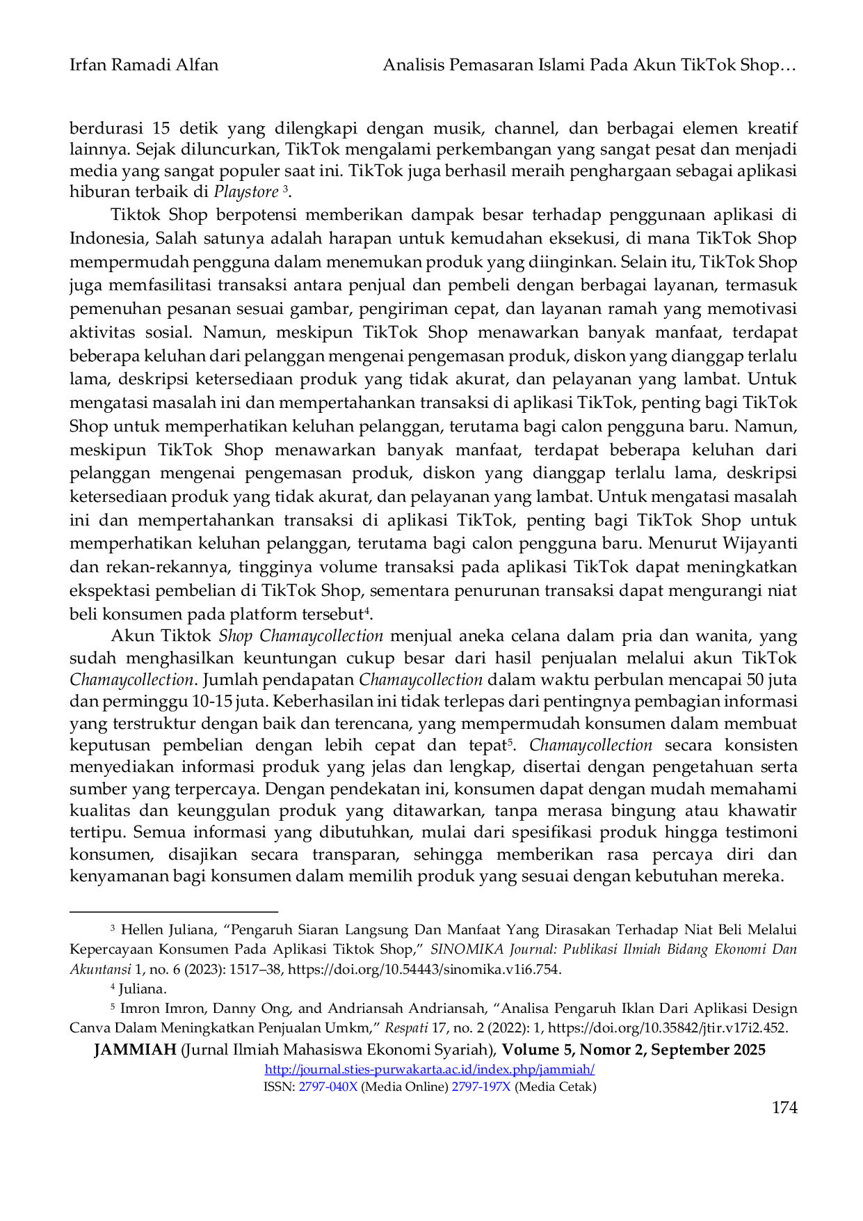 JAMMIAH (Jurnal Ilmiah Mahasiswa Ekonomi Syariah)JAMMIAH (Jurnal Ilmiah Mahasiswa Ekonomi Syariah)Akun TikTok Chamaycollection adalah UMKM fashion di TikTok Shop yang menjual boxer, buste houder, dan celana dalam pria-wanita. Dengan jangkauan pengiriman hingga Papua dan Pulau Jawa, usaha ini mencatat omset Rp15 juta/minggu dan Rp50 juta/bulan. Tujuan penelitian ini untuk mengetahui pemasaran pada akun TikTok Shop @Chamaycollection, dan untuk mengetahui pemasaran Islami pada akun TikTok Shop @Chamaycollection. Metode yang digunakan dalam penelitian ini adalah deskriptif kualitatif. Sumber data primer yang didapatkan dari hasil observasi dan wawancara terhadap pemilik serta konsumen akun TikTok Shop @Chamaycollection. Teknik pengambilan sampel dilakukan dengan metode snowball sampling, dimana informan awal (pemilik akun) merekomendasikan konsumen lain yang relevan untuk diwawancarai. Untuk menguji keabsahan data peneliti menggunakan teknik triangulasi data dan triangulasi metode. Berdasarkan hasil pembahasan tentang Pemasaran pada Akun TikTok Shop Chamaycollection dengan menggunakan teori 4P (produk, harga, tempat dan promosi) dapat disimpulkan: 1) Produk, mendeskripsikan produk secara jelas, termasuk bahan, ukuran dan warna; 2) Harga, memberikan harga khusus untuk pembelian dalam jumlah banyak; 3) Tempat, mengikuti tren dan tantangan yang sedang viral di TikTok untuk meningkatkan visibilitas pengunjung; 4) Promosi, menyelenggarakan giveaway dengan hadiah menarik untuk meningkatkan engagement rate. Selanjutnya, pemasaran Islami pada akun TikTok Shop Chamaycollection mengkorelasikan teori 4P (produk, harga, tempat dan promosi) dengan nilai-nilai pemasaran Islami (ketuhanan, etis, realistis, humanistis) mendapatkan respon pemasaran Islami yang diterapkan belum maksimal, karena masih terdapat indikator pemasaran Islami yang tidak di manfaatkan secara maksimal, seperti deskripsi produk yang disajikan terkadang tidak sesuai dengan produk yang diterima, hal ini terbukti dari ulasan bintang yang diberikan oleh pelanggan.