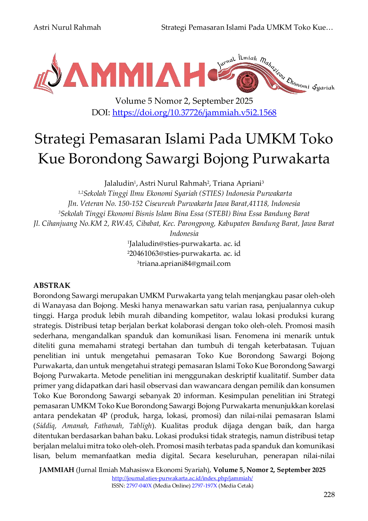 JAMMIAH (Jurnal Ilmiah Mahasiswa Ekonomi Syariah)JAMMIAH (Jurnal Ilmiah Mahasiswa Ekonomi Syariah)Borondong Sawargi merupakan UMKM Purwakarta yang telah menjangkau pasar oleh-oleh di Wanayasa dan Bojong. Meski hanya menawarkan satu varian rasa, penjualannya cukup tinggi. Harga produk lebih murah dibanding kompetitor, walau lokasi produksi kurang strategis. Distribusi tetap berjalan berkat kolaborasi dengan toko oleh-oleh. Promosi masih sederhana, mengandalkan spanduk dan komunikasi lisan. Fenomena ini menarik untuk diteliti guna memahami strategi bertahan dan tumbuh di tengah keterbatasan. Tujuan penelitian ini untuk mengetahui pemasaran Toko Kue Borondong Sawargi Bojong Purwakarta, dan untuk mengetahui strategi pemasaran Islami Toko Kue Borondong Sawargi Bojong Purwakarta. Metode penelitian ini menggunakan deskriptif kualitatif. Sumber data primer yang didapatkan dari hasil observasi dan wawancara dengan pemilik dan konsumen Toko Kue Borondong Sawargi sebanyak 20 informan. Kesimpulan penelitian ini Strategi pemasaran UMKM Toko Kue Borondong Sawargi Bojong Purwakarta menunjukkan korelasi antara pendekatan 4P (produk, harga, lokasi, promosi) dan nilai-nilai pemasaran Islami (Siddiq, Amanah, Fathanah, Tabligh). Kualitas produk dijaga dengan baik, dan harga ditentukan berdasarkan bahan baku. Lokasi produksi tidak strategis, namun distribusi tetap berjalan melalui mitra toko oleh-oleh. Promosi masih terbatas pada spanduk dan komunikasi lisan, belum memanfaatkan media digital. Secara keseluruhan, penerapan nilai-nilai pemasaran Islami belum maksimal, terlihat dari kurangnya transparansi informasi produk, minimnya inovasi, dan terbatasnya akses konsumen terhadap negosiasi dan variasi produk.
