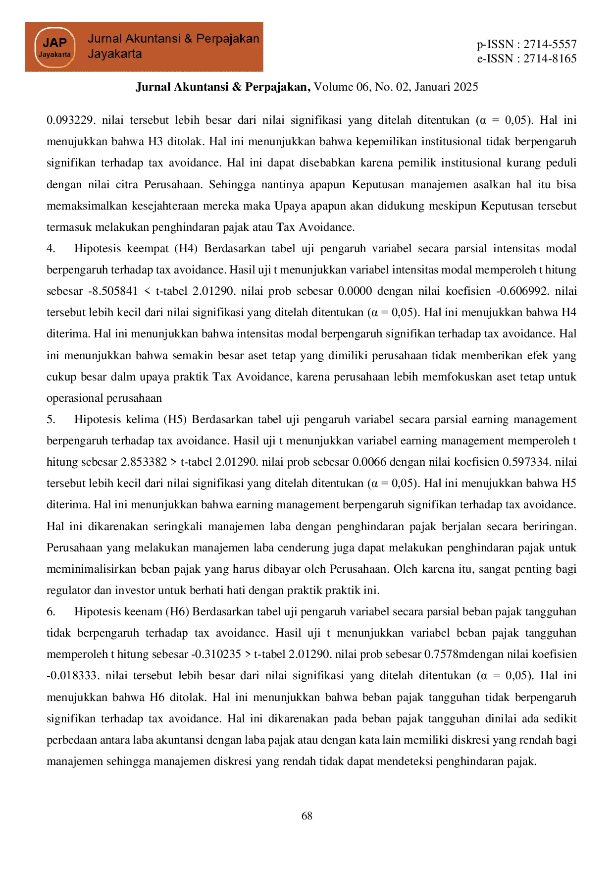 Berdasarkan analisis yang telah dibahas, dapat disimpulkan bahwa Good Corporate Governance yang diwakili oleh Dewan Komisaris Independen dan kepemilikan institusional, serta faktor-faktor lain seperti intensitas modal, pengelolaan laba, dan beban pajak tangguhan memiliki pengaruh signifikan terhadap penghindaran pajak.Dewan Komisaris independen berpengaruh signifikan terhadap tax avoidance, hal ini dikarenakan dewan komisaris independen memiliki potensi untuk berkurangnya praktik penghindaran pajak.Earning management berpengaruh signifikan terhadap tax avoidance, hal ini dikarenakan seringkali manajemen laba berjalan secara beriringan dengan penghindaran pajak.