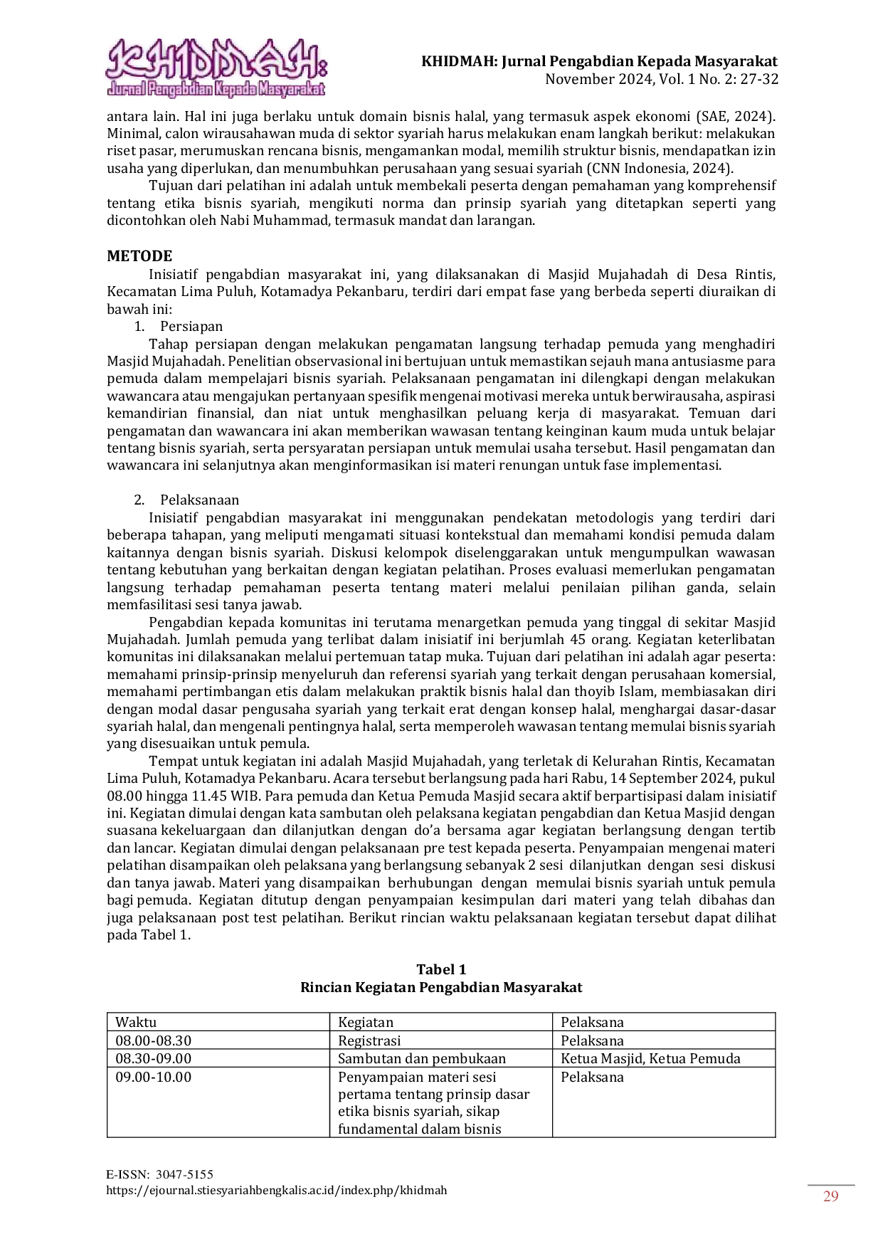 KHIDMAH: Jurnal Pengabdian Kepada MasyarakatKHIDMAH: Jurnal Pengabdian Kepada MasyarakatTujuan dari inisiatif pengabdian masyarakat ini adalah untuk memberikan strategi yang efektif untuk memulai usaha yang sesuai dengan syariah bagi individu pemula dikalangan pemuda di lingkungan masjid mujahadah Pekanbaru. Pendekatan metodologis yang diadopsi adalah kerangka seminar pelatihan bisnis syariah, yang mencakup empat fase berbeda: fase persiapan yang melibatkan diskusi observasional dan wawancara, diikuti oleh fase implementasi di mana pelatihan dilakukan bersama dengan penyebaran materi yang berkaitan dengan strategi efektif untuk membangun bisnis syariah, selanjutnya mengarah ke fase evaluasi dan kompilasi laporan layanan. Hasil evaluasi menunjukkan bahwa tingkat motivasi di kalangan pemuda telah meningkat secara signifikan setelah pelatihan bisnis syariah, dengan sekitar 86 persen peserta menyatakan peningkatan motivasi yang berasal dari inisiatif ini. Akhirnya, tahap keberlanjutan akan dilaksanakan sesuai dengan temuan evaluasi yang dilakukan dan pelaporan hasil upaya pengabdian masyarakat.
