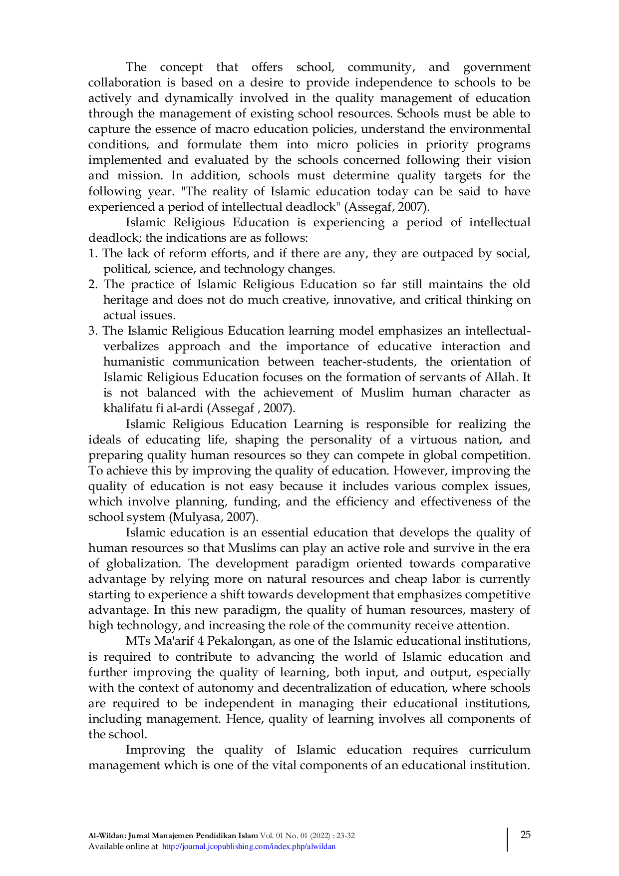 Al Wildan: Jurnal Manajemen Pendidikan IslamAl Wildan: Jurnal Manajemen Pendidikan IslamPenelitian ini bertujuan untuk menganalisis implementasi manajemen mutu pada pembelajaran pendidikan agama Islam serta faktor-faktor yang menjadi pendukung dan penghambat. Penelitian ini bersifat deskriptif kualitatif. Pengumpulan data dilakukan dengan cara wawancara, observasi, dan dokumentasi. Data dianalisis dengan cara reduksi data, penyajian data dan penarikan kesimpulan. Hasil analisis 1) Terangkum dalam penyusunan rencana pekan efektif, pemetaan SK/KD, KKM, program tahunan, program semester, silabus, dan RPP, (2) Menerapkan media yang menarik, melaksanakan kegiatan ekstrakurikuler, (3) Guru menyediakan media serta kelengkapan pembelajaran membentuk wewenang koordinasi pembelajaran di kelas, mengikuti pelatihan-pelatihan, (4) Guru mengawasi kegiatan pembelajaran di kelas, mengevaluasi hasil pelaksanaan pembelajaran, pengasawan dalam proses evaluasi berbentuk test atau pemberian tugas. (5) Menyusun soal/perangkat penilaian, melaksanakan penilaian, memeriksa jawaban, menilai hasil belajar, mengelola hasil belajar, menganalisis hasil belajar, menyipulkan hasil penilaian secara jelas dan logis, menyusun laporan hasil belajar, dan memperbaiki soal/perangkat penilaian. Faktor pendukung (1) bertambahnya alokasi waktu, (2) adanya bantuan pelatihan, (3) hubungan yang baik antar guru, (4) dukungan kepala sekolah bagi guru, (5) pengawasan guru, faktor penghambat (1) minimnya sarana dan media belajar, (2) kurangnya inovasi dalam penyusunan rencana belajar, (3) minimnya praktek perserta didik di luar sekolah. (6) pengawasan oleh kepala sekolah.