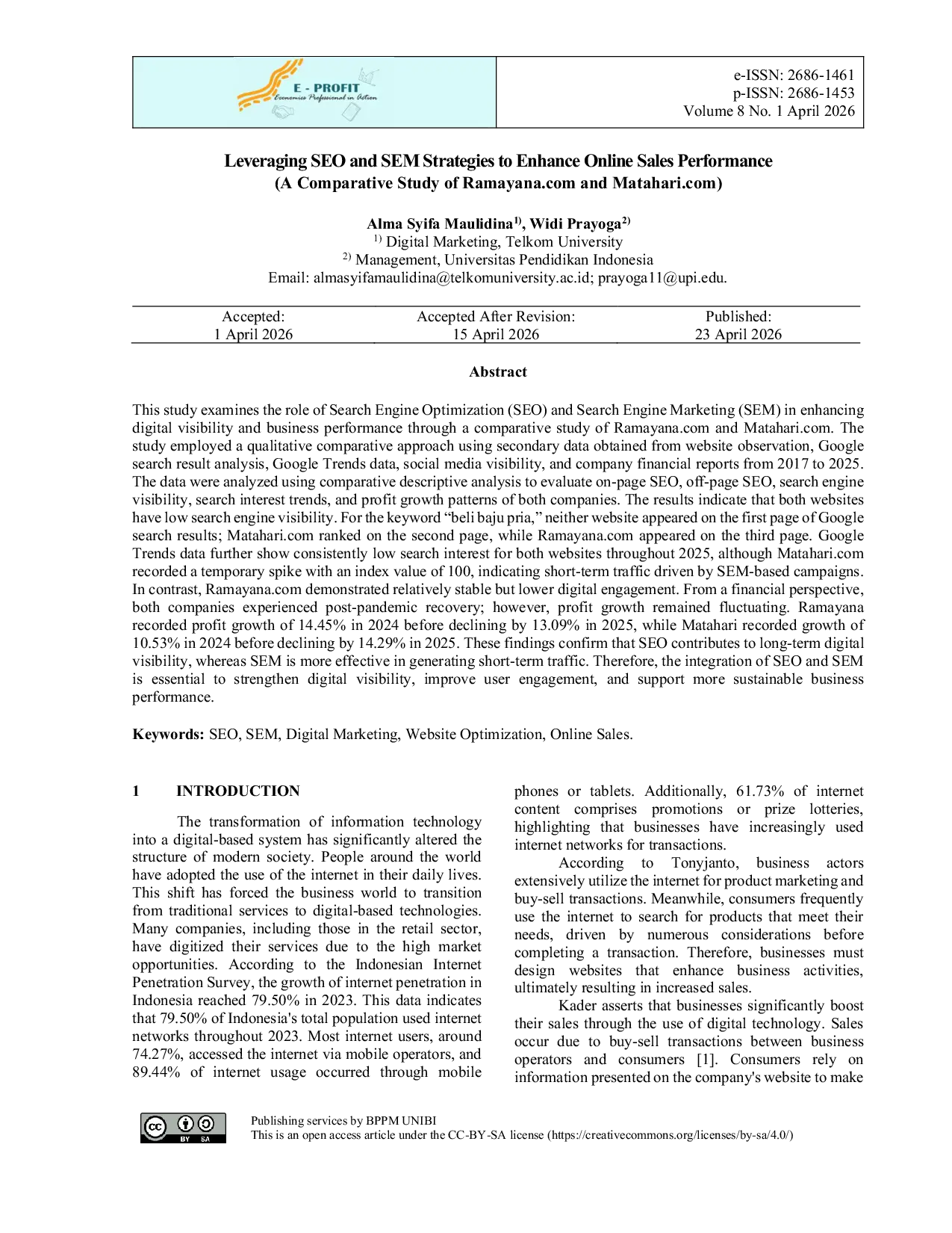Economics Professional in Action (E-Profit)Economics Professional in Action (E-Profit)Penelitian ini mengkaji peran Search Engine Optimization (SEO) dan Search Engine Marketing (SEM) dalam meningkatkan visibilitas digital dan kinerja bisnis melalui studi komparatif antara Ramayana.com dan Matahari.com. Penelitian menggunakan pendekatan komparatif kualitatif dengan data sekunder dari observasi website, analisis hasil pencarian Google, data Google Trends, visibilitas media sosial, dan laporan keuangan perusahaan dari tahun 2017 hingga 2025. Data dianalisis menggunakan analisis deskriptif komparatif untuk mengevaluasi SEO on-page, SEO off-page, visibilitas mesin pencari, tren minat pencarian, serta pola pertumbuhan laba kedua perusahaan. Hasil menunjukkan bahwa kedua website memiliki visibilitas mesin pencari yang rendah. Untuk kata kunci beli baju pria, tidak ada satu pun website yang muncul di halaman pertama hasil pencarian Google; Matahari.com berada di halaman kedua, sedangkan Ramayana.com di halaman ketiga. Data Google Trends juga menunjukkan minat pencarian yang konsisten rendah sepanjang 2025, meskipun Matahari.com mencatat lonjakan sementara dengan nilai indeks 100, menunjukkan lalu lintas jangka pendek yang didorong oleh kampanye berbasis SEM. Sebaliknya, Ramayana.com menunjukkan keterlibatan digital yang relatif stabil namun lebih rendah. Dari perspektif keuangan, kedua perusahaan mengalami pemulihan pasca-pandemi; namun, pertumbuhan laba tetap fluktuatif. Ramayana mencatat pertumbuhan laba 14,45% pada 2024 sebelum turun 13,09% pada 2025, sementara Matahari mencatat pertumbuhan 10,53% pada 2024 sebelum turun 14,29% pada 2025. Temuan ini menegaskan bahwa SEO berkontribusi terhadap visibilitas digital jangka panjang, sedangkan SEM lebih efektif dalam menghasilkan lalu lintas jangka pendek. Oleh karena itu, integrasi SEO dan SEM sangat penting untuk memperkuat visibilitas digital, meningkatkan keterlibatan pengguna, dan mendukung kinerja bisnis yang lebih berkelanjutan.
