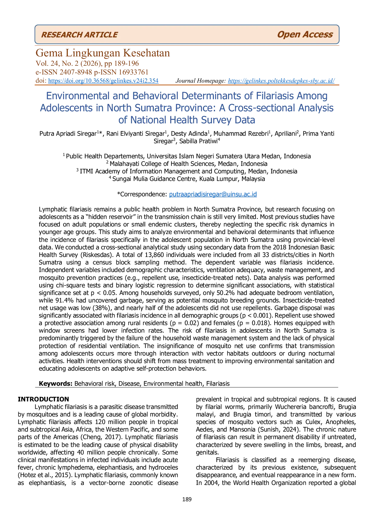 Gema Lingkungan KesehatanGema Lingkungan KesehatanLinfatik filariasis tetap menjadi masalah kesehatan masyarakat di Provinsi Sumatera Utara, tetapi penelitian yang berfokus pada remaja sebagai reservoir tersembunyi dalam rantai penularan masih sangat terbatas. Sebagian besar studi sebelumnya berfokus pada populasi dewasa atau kluster endemik kecil, sehingga mengabaikan dinamika risiko spesifik pada kelompok usia yang lebih muda. Penelitian ini bertujuan untuk menganalisis faktor-faktor lingkungan dan perilaku yang mempengaruhi insiden filariasis secara khusus pada populasi remaja di Sumatera Utara menggunakan data tingkat provinsi. Dilakukan studi analitis cross-sectional menggunakan data sekunder dari Survei Kesehatan Dasar Indonesia (Riskesdas) tahun 2018. Sebanyak 13.860 individu dari seluruh 33 kabupaten/kota di Sumatera Utara termasuk dalam penelitian ini menggunakan metode sampling blok sensus. Variabel terikat adalah insiden filariasis. Variabel independen meliputi karakteristik demografis, kecukupan ventilasi kamar tidur, pengelolaan sampah, dan praktik pencegahan nyamuk (seperti penggunaan repellent dan kelambu yang telah diolesi insektisida). Analisis data dilakukan menggunakan uji chi-square dan regresi logistik biner untuk menentukan asosiasi yang signifikan, dengan tingkat signifikansi statistik ditetapkan pada p < 0,05. Di antara rumah tangga yang disurvei, hanya 50,2% memiliki ventilasi kamar tidur yang memadai, sedangkan 91,4% memiliki sampah yang tidak tertutup, yang dapat menjadi tempat berkembang biak nyamuk. Penggunaan kelambu yang telah diolesi insektisida rendah (38%), dan hampir setengah dari remaja tidak menggunakan repellent. Pembuangan sampah secara signifikan terkait dengan insiden filariasis pada semua kelompok demografis (p < 0,001). Penggunaan repellent menunjukkan asosiasi protektif pada penduduk pedesaan (p = 0,02) dan perempuan (p = 0,018). Rumah yang dilengkapi dengan kawat kasa pada jendela memiliki tingkat infeksi yang lebih rendah. Risiko filariasis pada remaja di Sumatera Utara terutama dipicu oleh kegagalan sistem pengelolaan sampah rumah tangga dan kurangnya perlindungan fisik ventilasi tempat tinggal. Ketidaksignifikan penggunaan kelambu mengonfirmasi bahwa penularan pada remaja terjadi lebih melalui interaksi dengan habitat vektor di luar ruangan atau selama aktivitas malam hari. Intervensi kesehatan harus bergeser dari pengobatan massal ke perbaikan sanitasi lingkungan dan mendidik remaja tentang perilaku perlindungan diri adaptif.