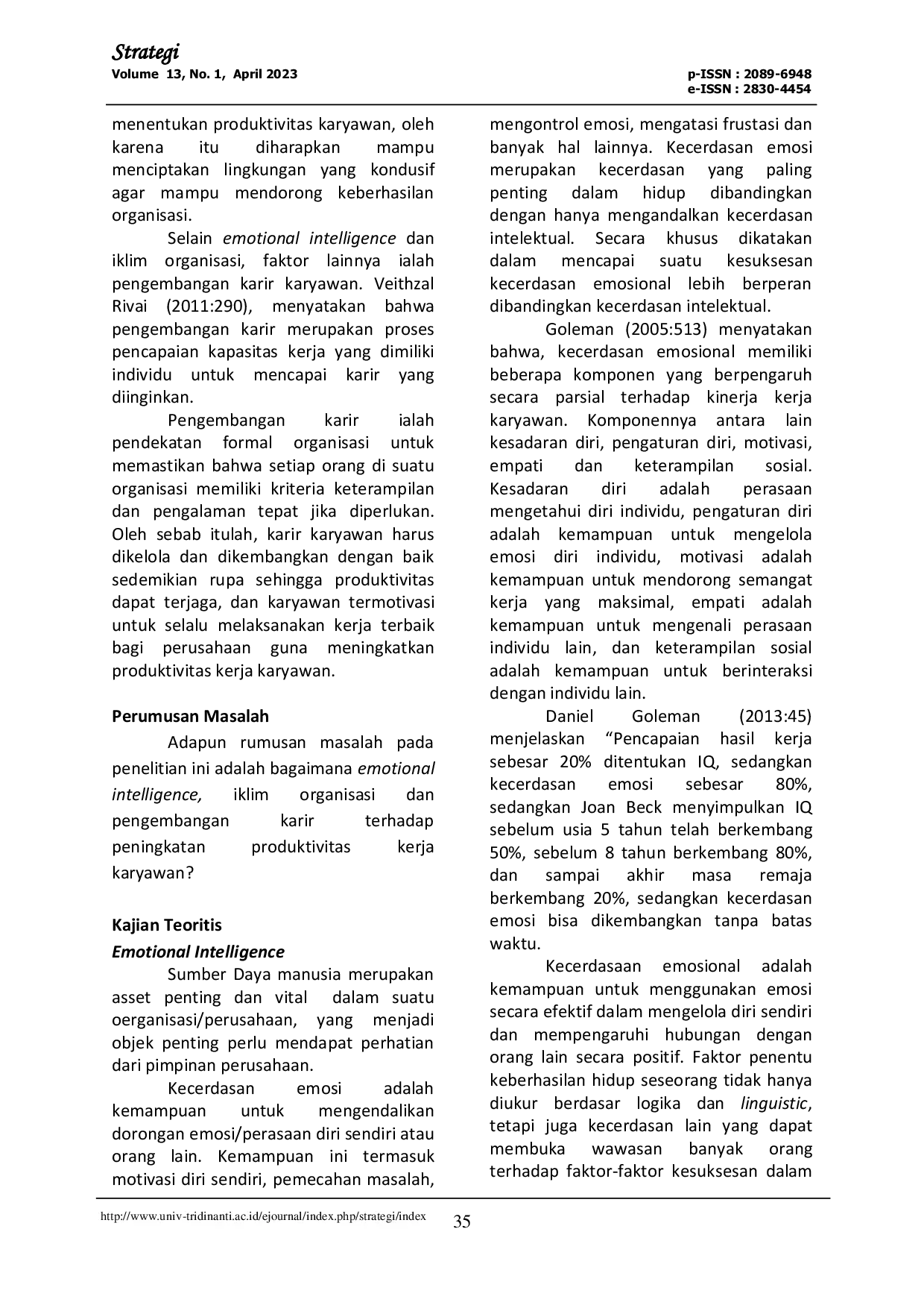 StrategiStrategiProduktivitas kerja karyawan merupakan hal penting bagi suatu perusahaan sebagai ukuran kesuksesan menjalankan bisnis. Dimana keuntungan dan produktivitas tenaga kerja akan semakin tinggi jika produktivitas kerja karyawan di perusahaan meningkat. Banyak faktor yang berpengaruh terhadap produktivitas kerja karyawan, namun dalam penelitian ini hanya membahas emotional intelligence, iklim organisasi dan pengembangan karir. Emotional Intelligence merupakan kecerdasan yang terpenting dalam kehidupan dibanding hanya mengandalkan kecerdasan intelektual. Sedangkan iklim organisasi menentukan kenyamanan dalam berkerja. Bagi perusahaan, faktor pengembangan karir merupakan hal penting terkait kebutuhan yang perlu dikembangkan dalam diri seorang karyawan untuk memotivasi karyawan dalam meningkatkan kinerja dan produktivitas kerja. Adapun desain yang digunakan dalam penelitian ini termasuk jenis penelitian deskripsi kualitatif.