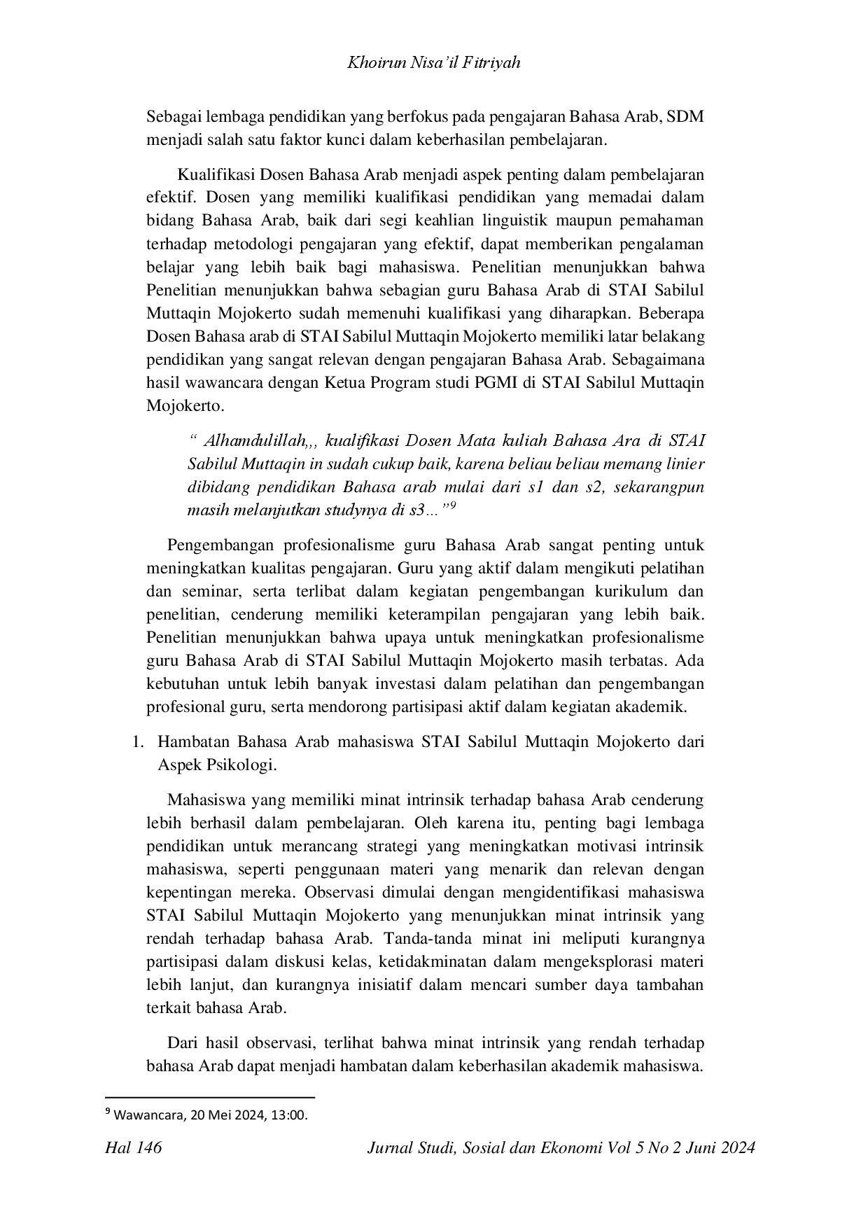 Kualifikasi dosen Bahasa Arab yang memadai diperlukan untuk meningkatkan kualitas pembelajaran, sekaligus diperlukan program pengembangan profesional yang berkelanjutan.Strategi untuk meningkatkan motivasi intrinsik mahasiswa melalui materi yang relevan dan menarik juga harus dikembangkan.Di samping itu, perlu upaya lebih fokus dalam menangani kesulitan linguistik seperti fonologi, tata bahasa, dan penggunaan asmaul khomsah melalui pendekatan pembelajaran yang terarah.