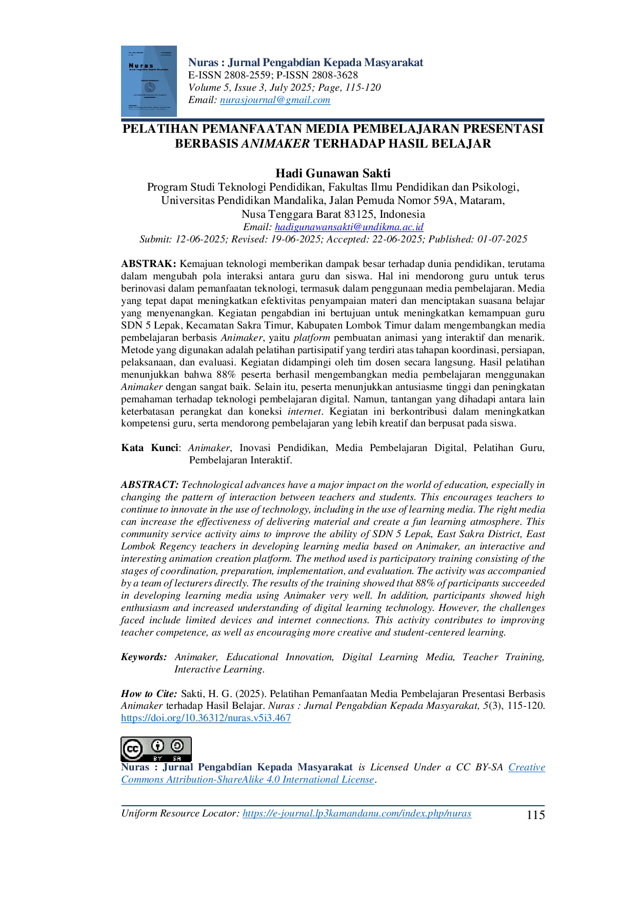 Nuras : Jurnal Pengabdian Kepada MasyarakatNuras : Jurnal Pengabdian Kepada MasyarakatKemajuan teknologi memberikan dampak besar terhadap dunia pendidikan, terutama dalam mengubah pola interaksi antara guru dan siswa. Hal ini mendorong guru untuk terus berinovasi dalam pemanfaatan teknologi, termasuk dalam penggunaan media pembelajaran. Media yang tepat dapat meningkatkan efektivitas penyampaian materi dan menciptakan suasana belajar yang menyenangkan. Kegiatan pengabdian ini bertujuan untuk meningkatkan kemampuan guru SDN 5 Lepak, Kecamatan Sakra Timur, Kabupaten Lombok Timur dalam mengembangkan media pembelajaran berbasis Animaker, yaitu platform pembuatan animasi yang interaktif dan menarik. Metode yang digunakan adalah pelatihan partisipatif yang terdiri atas tahapan koordinasi, persiapan, pelaksanaan, dan evaluasi. Kegiatan didampingi oleh tim dosen secara langsung. Hasil pelatihan menunjukkan bahwa 88% peserta berhasil mengembangkan media pembelajaran menggunakan Animaker dengan sangat baik. Selain itu, peserta menunjukkan antusiasme tinggi dan peningkatan pemahaman terhadap teknologi pembelajaran digital. Namun, tantangan yang dihadapi antara lain keterbatasan perangkat dan koneksi internet. Kegiatan ini berkontribusi dalam meningkatkan kompetensi guru, serta mendorong pembelajaran yang lebih kreatif dan berpusat pada siswa.