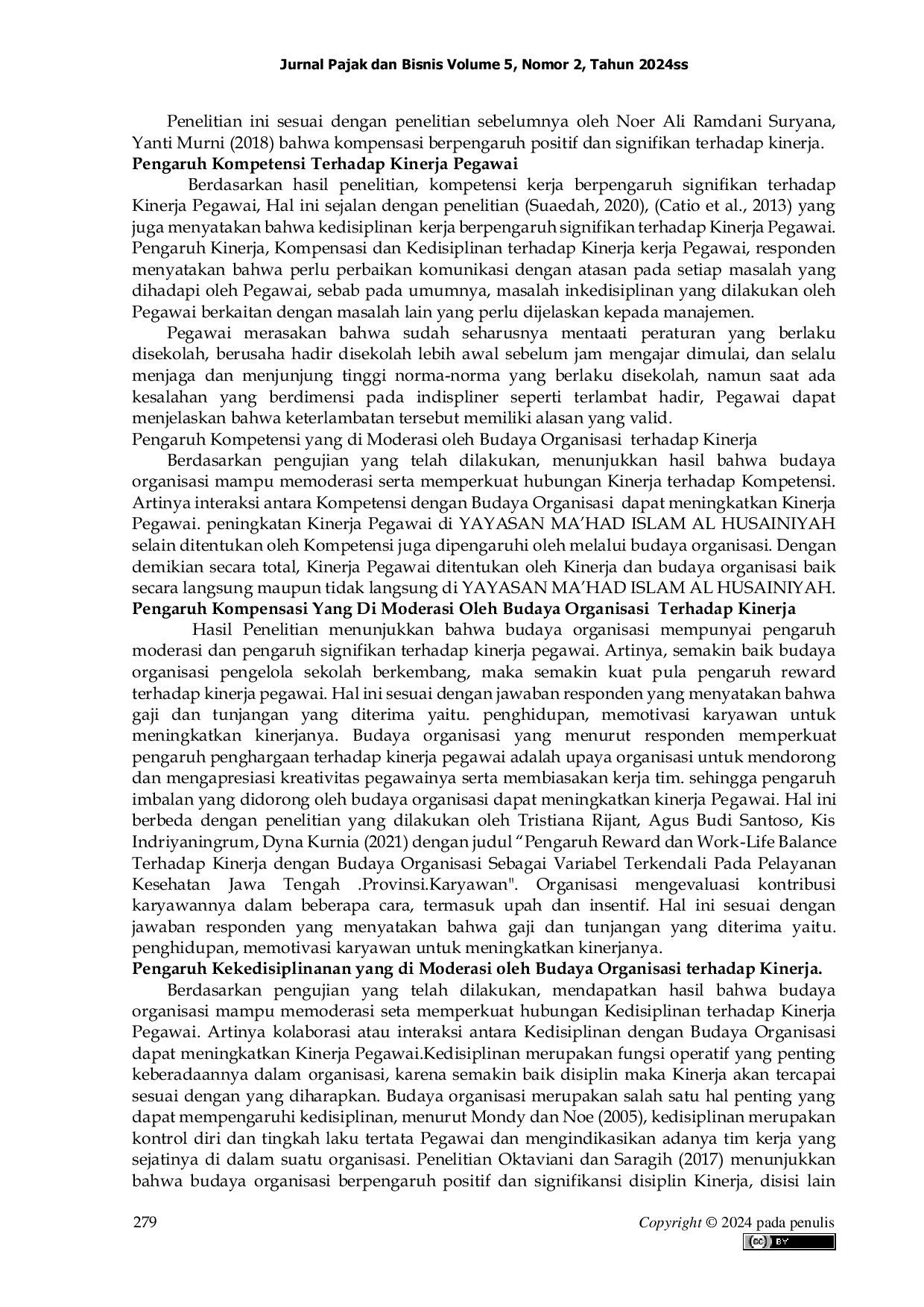 Journal of Tax and BusinessJournal of Tax and BusinessMotivasi, Kompetensi, Kompensasi dan Budaya Organisasi mempunyai pengaruh yang besar pada Kinerja Pegawai yayasan. Dari keempat variable tersebut dapat dibuktikan bahwa penelitian ini bertujuan untuk menganalisis pengaruh Motivasi, Kompetensi dan Kompensasi terhadap Kinerja Pegawai dengan Budaya Organisasi sebagai variabel moderating di Yayasan Islam Al Husainiyah. Penelitian dilaksanakan pada Yayasan Islam Al husainiyah melalui sampel penelitian terhadap 102 Pegawai, menggunakan rumus persamaan melalui uji interaksi atau kata lainnya Moderated Regression Analysis (MRA) dengan total populasi 102 Pegawai pada margin error 5%. Sedangkan dalam pengumpulan data menggunakan Teknik metode wawancara, kuisioner, juga observasi. Dalam pengolahan data digunakan aplikasi SPSS, untuk uji data yang digunakan dalam penelitian ini adalah uji reliabilitas, uji validitas, uji statistik dan uji asumsi klasik. Hasil penelitian ini menunjukkan Motivasi, Kompetensi, dan Kompensasi memiliki pengaruh positif dan signifikan terhadap Kinerja. Sementara itu Budaya Organisasi dapat memediasi hubungan antara Motivasi, Kompetensi dengan Kinerja. Sedangkan Budaya Organisasi tidak memediasi antara hubungan Kompensasi terhadap Kinerja Pegawai.