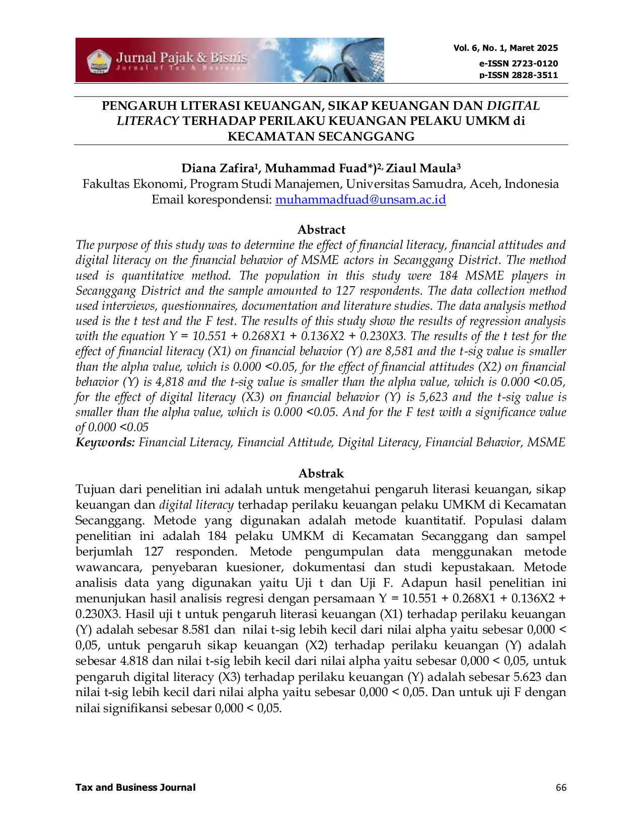 Journal of Tax and BusinessJournal of Tax and BusinessTujuan dari penelitian ini adalah untuk mengetahui pengaruh literasi keuangan, sikap keuangan dan digital literacy terhadap perilaku keuangan pelaku UMKM di Kecamatan Secanggang. Metode yang digunakan adalah metode kuantitatif. Populasi dalam penelitian ini adalah 184 pelaku UMKM di Kecamatan Secanggang dan sampel berjumlah 127 responden. Metode pengumpulan data menggunakan metode wawancara, penyebaran kuesioner, dokumentasi dan studi kepustakaan. Metode analisis data yang digunakan yaitu Uji t dan Uji F. Adapun hasil penelitian ini menunjukan hasil analisis regresi dengan persamaan Y = 10.551 0.268X1 0.136X2 0.230X3. Hasil uji t untuk pengaruh literasi keuangan (X1) terhadap perilaku keuangan (Y) adalah sebesar 8.581 dan nilai t-sig lebih kecil dari nilai alpha yaitu sebesar 0,000 < 0,05, untuk pengaruh sikap keuangan (X2) terhadap perilaku keuangan (Y) adalah sebesar 4.818 dan nilai t-sig lebih kecil dari nilai alpha yaitu sebesar 0,000 < 0,05, untuk pengaruh digital literacy (X3) terhadap perilaku keuangan (Y) adalah sebesar 5.623 dan nilai t-sig lebih kecil dari nilai alpha yaitu sebesar 0,000 < 0,05. Dan untuk uji F dengan nilai signifikansi sebesar 0,000 < 0,05.
