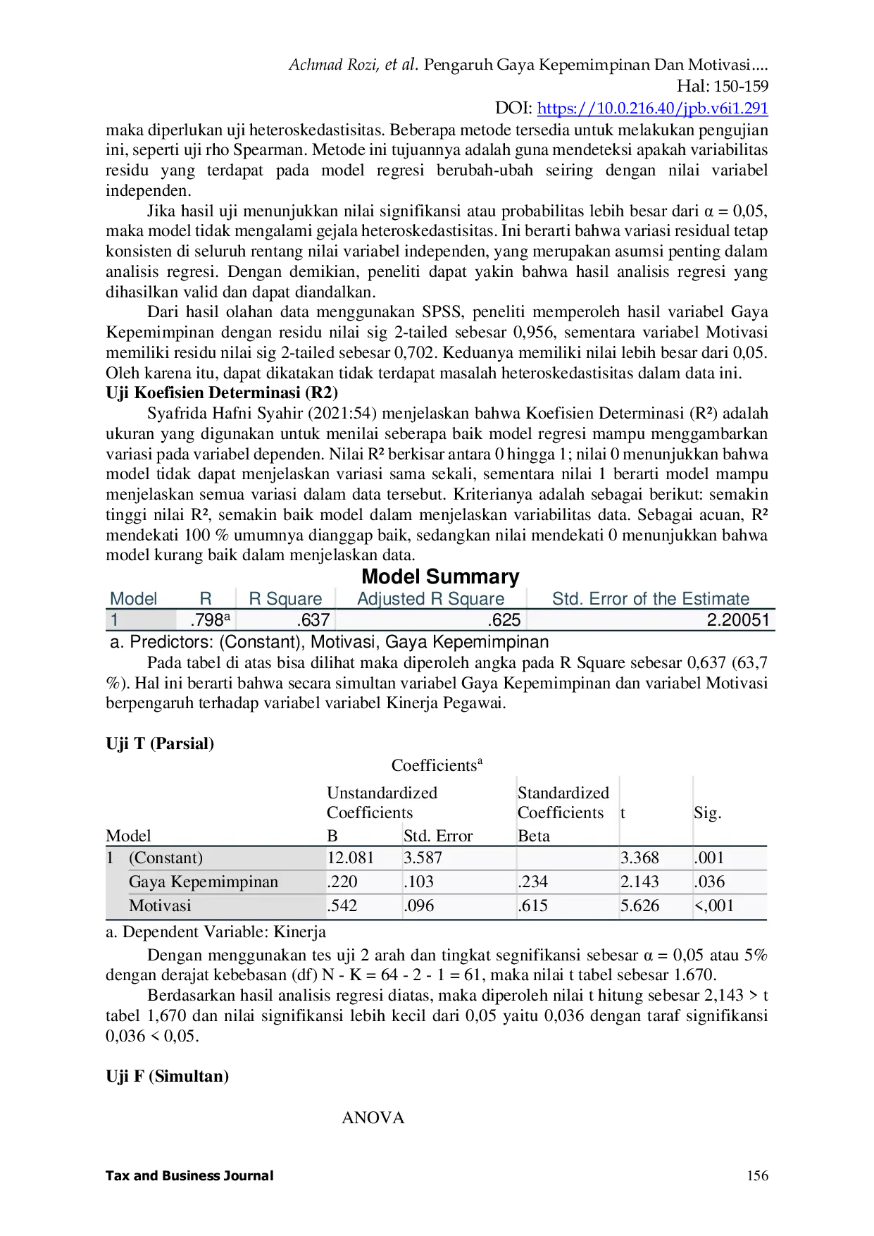 Journal of Tax and BusinessJournal of Tax and BusinessSumber daya manusia merupakan hal terpenting yang harus dimiliki perusahaan. Oleh karenanya dibutuhkan pegawai yang memiliki kinerja handal. Ada beberapa faktor yang mempengaruhi kinerja pegawai diantaranya gaya kepemimpinan dan motivasi karena hal tersebut diduga dapat mempengaruhi kinerja seorang pegawai. Penelitian ini memiliki tujuan untuk mengetahui seberapa besar dampak atau pengaruh secara parsial maupun secara simultan antara gaya kepemimpinan dan motivasi terhadap kinerja pegawai desa di Kecamatan Kibin. Metode penelitian yang digunakan adalah kuantitatif dengan populasi sebanyak 64 pegawai desa dengan teknik sampel jenuh serta kuesioner disebarkan kepada 64 pegawai desa di Kecamatan Kibin. Hasil Hipotesis pertama H1 nilai t hitung > t tabel yaitu 2,143 > 1,670 dan signifikansi 0,036 < 0,05 maka Ha diterima dan Ho ditolak. H2 nilai nilai t hitung > t tabel yaitu 5,626 > 1,670 dan signifikansi 0,001 < 0,05 maka Ha diterima dan Ho ditolak. H3 nilai nilai f hitung > f tabel yaitu 21,895 > 3,15 maka Ha diterima dan Ho ditolak. Berdasarkan hasil pengujian hipotesis dapat diambil kesimpulan bahwa gaya kepemimpinan dan motivasi berpengaruh secara signifikan terhadap kinerja pegawai desa di Kecamatan Kibin.