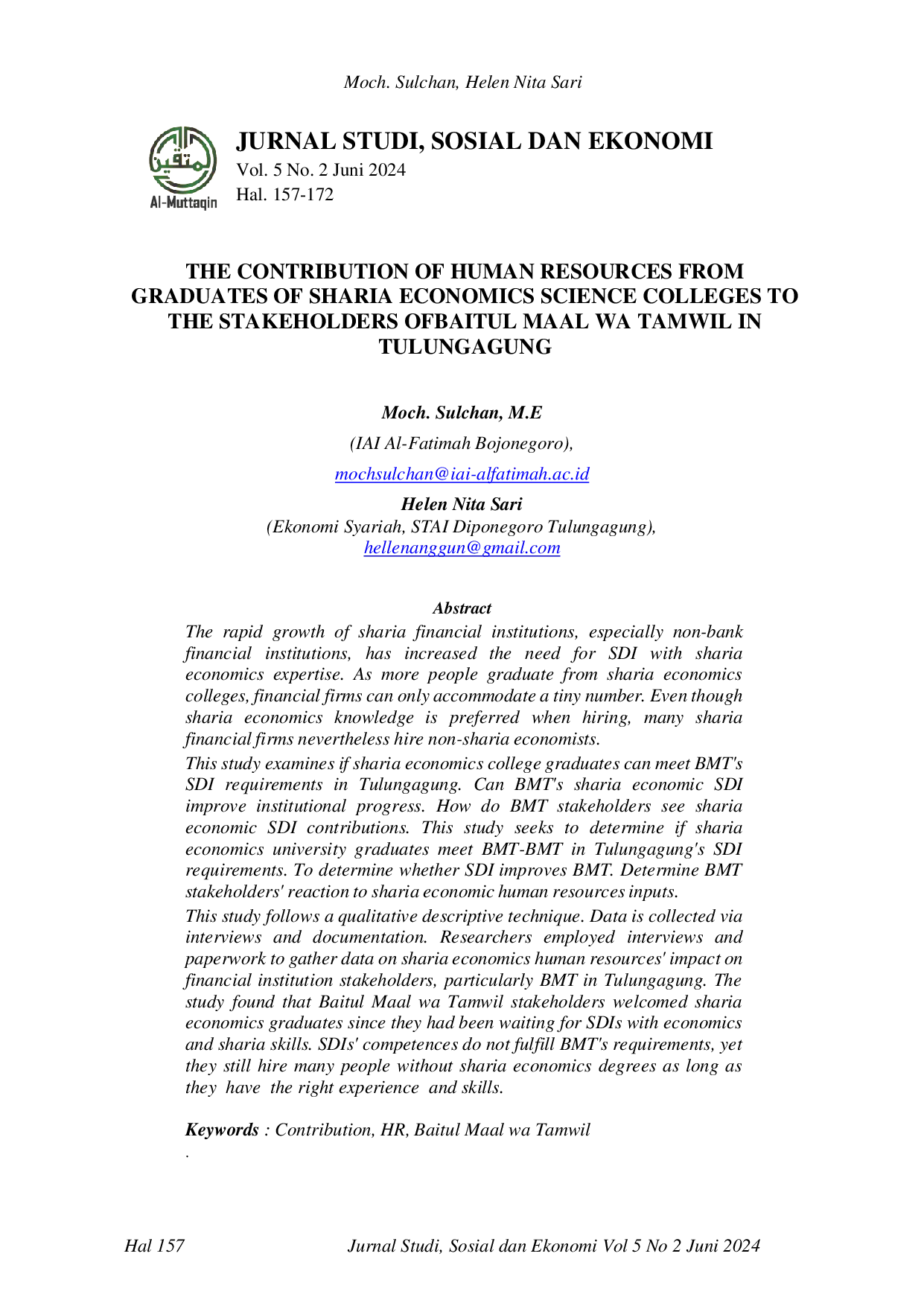 Al-Muttaqin : Jurnal Studi, Sosial, dan EkonomiAl-Muttaqin : Jurnal Studi, Sosial, dan EkonomiPesatnya pertumbuhan lembaga keuangan syariah, khususnya lembaga keuangan non-bank, meningkatkan kebutuhan akan SDI yang memiliki keahlian ekonomi syariah. Dengan semakin banyaknya orang yang lulus dari perguruan tinggi ekonomi syariah, perusahaan keuangan hanya mampu menampung sejumlah kecil orang. Meskipun pengetahuan ekonomi syariah lebih disukai ketika merekrut, banyak perusahaan keuangan syariah tetap mempekerjakan ekonom non-syariah. Penelitian ini mengkaji apakah lulusan perguruan tinggi ekonomi syariah dapat memenuhi persyaratan SDI BMT di Tulungagung. Apakah SDI ekonomi syariah BMT dapat meningkatkan kemajuan kelembagaan. Bagaimana pemangku kepentingan BMT melihat kontribusi SDI ekonomi syariah. Penelitian ini bertujuan untuk mengetahui apakah lulusan perguruan tinggi ekonomi syariah memenuhi persyaratan BMT‑BMT di Tulungagung. Untuk mengetahui apakah SDI meningkatkan BMT. Mengetahui reaksi pemangku kepentingan BMT terhadap masukan sumber daya manusia ekonomi syariah. Penelitian ini mengikuti teknik deskriptif kualitatif. Data dikumpulkan melalui wawancara dan dokumentasi. Peneliti menggunakan wawancara dan dokumen untuk mengumpulkan data mengenai dampak sumber daya manusia ekonomi syariah terhadap pemangku kepentingan lembaga keuangan, khususnya BMT di Tulungagung. Studi ini menemukan bahwa pemangku kepentingan Baitul Maal wa Tamwil menyambut baik lulusan ekonomi syariah karena mereka sudah menunggu SDI dengan keterampilan ekonomi dan syariah. Kompetensi SDI tidak memenuhi persyaratan BMT, namun masih banyak yang mempekerjakan orang‑orang yang tidak mempunyai gelar ekonomi syariah asalkan mempunyai pengalaman dan keterampilan yang sesuai.