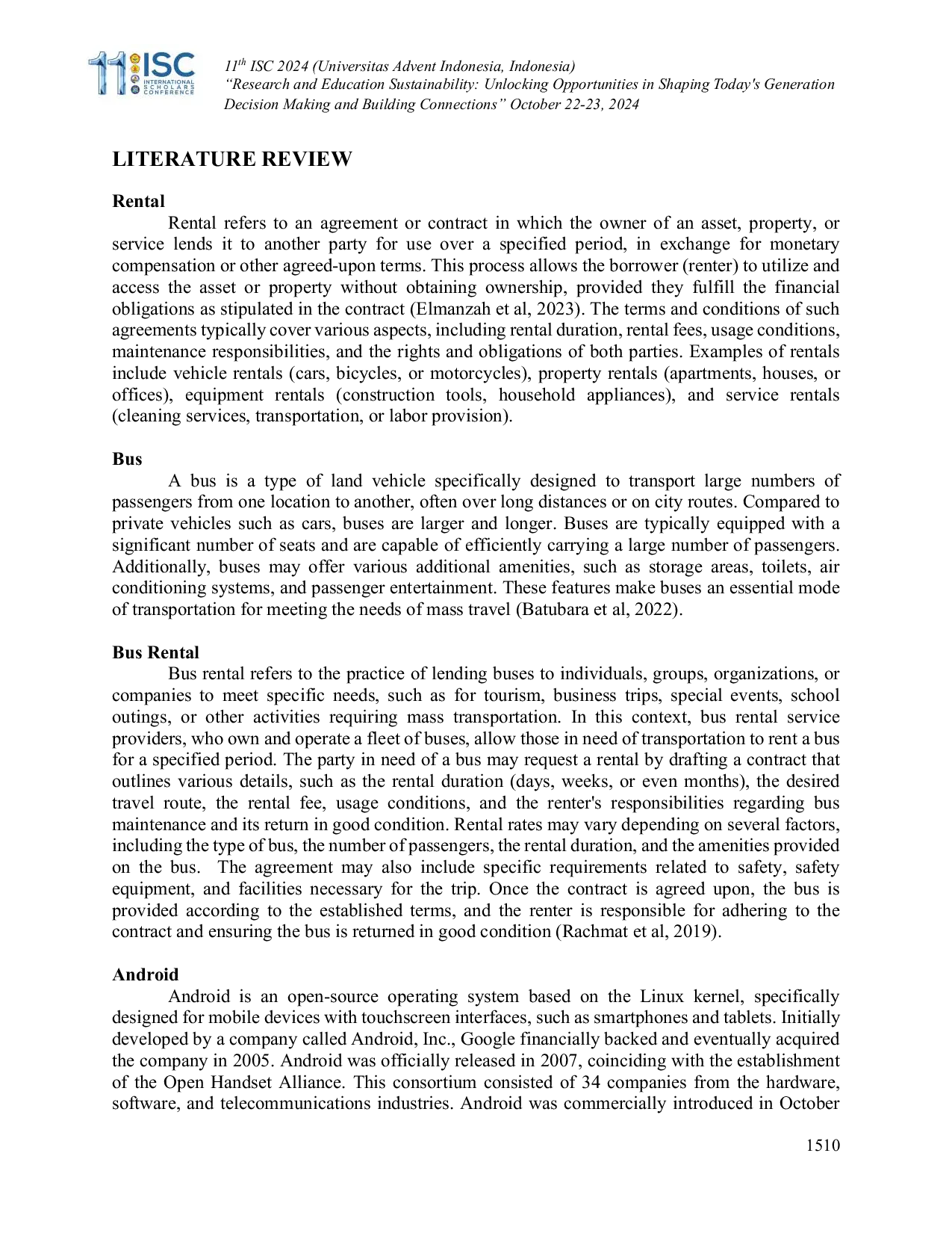 11th International Scholars Conference11th International Scholars ConferenceIn daily life, humans are inseparable from the need for transportation. As times progress and human needs evolve, the role of transportation becomes increasingly significant, resulting in the continuous growth of businesses in the transportation sector. Bus rental services in North Sulawesi, however, remain relatively inefficient, often relying on platforms like Facebook or WhatsApp, which is considered cumbersome. Therefore, the developer aims to create an Android-based application for bus rental service providers and customers. This application is designed to facilitate both parties, allowing bus rental service providers to post detailed information about their buses. The research employed a prototyping process method, supported by software tools such as React Native, Figma, and Firebase. The results show that the developed application can assist in improving the efficiency of bus rentals in North Sulawesi.