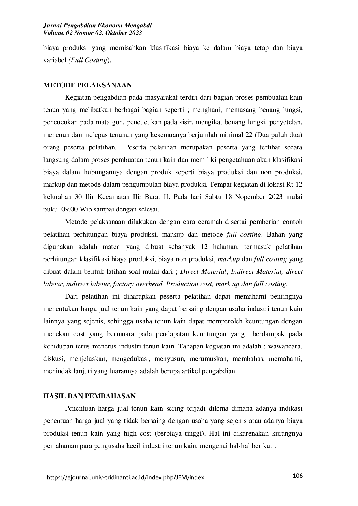 Jurnal Ekonomi MengabdiJurnal Ekonomi MengabdiTenun kain songket merupakan kain yang ditenun dengan menggunakan benang emas atau benang perak yang dihasilkan dari daerah-daerah tertentu saja di sebagian besar wilayah Indonesia. Dalam pembuatan tenun kain masih menggunakan alat tenun manual serta bahan yang digunakan masih bersifat alami sehingga tenun kain dikenal sebagai kain mewah para bangsawan yang menunjukkan derajat dan martabat pemakainya. Salah satu permasalahan yang sering dihadapi produksi tenun kain adalah besarnya biaya produksi (Production Cost) tenun kain dalam menentukan harga jual. Untuk dapat mengetahui besarnya biaya produksi dalam menentukan harga jual diperlukan pemahaman mengenai; Biaya bahan langsung (Direct Material), Biaya bahan tidak langsung (Indirect Material), Biaya tenaga kerja langsung (Direct Labour), Biaya tenaga kerja tidak langsung (Indirect Labour) dan Factory Overhead, Selling Exspense dan General and Adminstrative Exspense, Cost Plus Pricing dan Full Costing. Melalui pengabdian kepada masyarakat diharapkan agar peserta pengabdian sebagai pengusaha dapat memahami Klasifikasi biaya dalam hubungannya dengan produksi guna menentukan harga jual. Dengan demikian melalui pengabdian ini akan memberikan motivasi kepada para peserta untuk dapat mengetahui biaya produksi tenun kain dan dapat menentukan harga jual yang kompetitip. Sasaran dalam pengabdian ini adalah masayarakat Rt 12 Kelurahan 30 Ilir Kecamatan Ilir Barat II. Kegiatan ini dilaksanakan pada hari Sabtu : 18 Nopember 2023 jam 09.00 Wib sampai dengan selesai. Hasil kegiatan pengabdian menunjukkan bahwa telah terjadi peningkatan pemahaman tentang; Klasifikasi biaya dalam hubungannya dengan produksi dalam menentukan harga jual tenun kain (cost plus pricing), dan metode pengumpulan biaya produksi full costing.