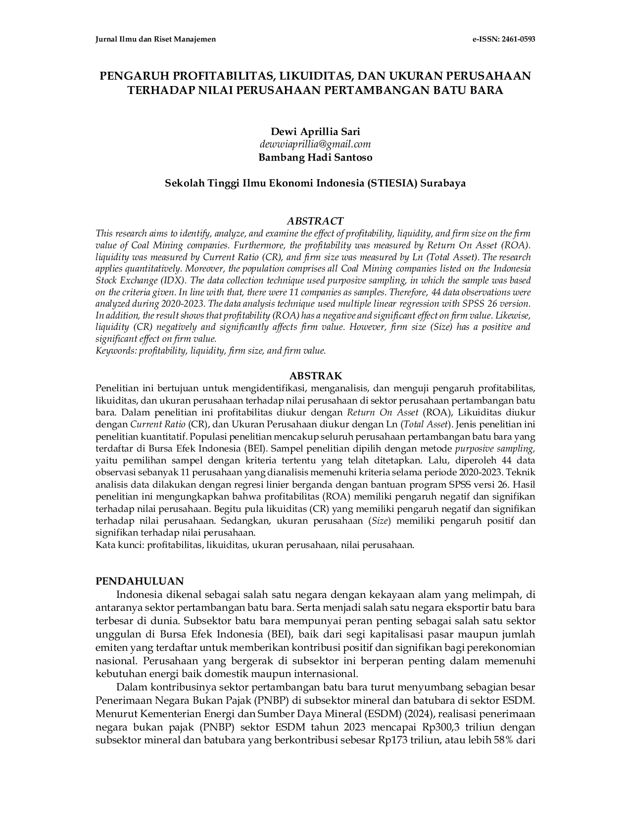 Jurnal Ilmu dan Riset Manajemen (JIRM)Jurnal Ilmu dan Riset Manajemen (JIRM)Penelitian ini bertujuan untuk mengidentifikasi, menganalisis, dan menguji pengaruh profitabilitas, likuiditas, dan ukuran perusahaan terhadap nilai perusahaan di sektor perusahaan pertambangan batu bara. Dalam penelitian ini profitabilitas diukur dengan Return On Asset (ROA), Likuiditas diukur dengan Current Ratio (CR), dan Ukuran Perusahaan diukur dengan Ln (Total Asset). Jenis penelitian ini penelitian kuantitatif. Populasi penelitian mencakup seluruh perusahaan pertambangan batu bara yang terdaftar di Bursa Efek Indonesia (BEI). Sampel penelitian dipilih dengan metode purposive sampling, yaitu pemilihan sampel dengan kriteria tertentu yang telah ditetapkan. Lalu, diperoleh 44 data observasi sebanyak 11 perusahaan yang dianalisis memenuhi kriteria selama periode 2020-2023. Teknik analisis data dilakukan dengan regresi linier berganda dengan bantuan program SPSS versi 26. Hasil penelitian ini mengungkapkan bahwa profitabilitas (ROA) memiliki pengaruh negatif dan signifikan terhadap nilai perusahaan. Begitu pula likuiditas (CR) yang memiliki pengaruh negatif dan signifikan terhadap nilai perusahaan. Sedangkan, ukuran perusahaan (Size) memiliki pengaruh positif dan signifikan terhadap nilai perusahaan.
