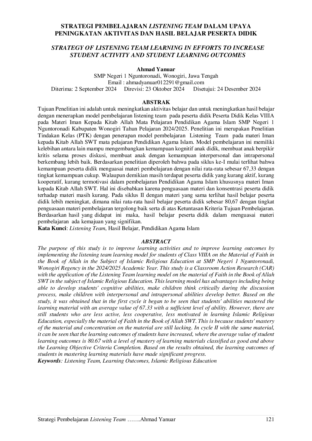 Jurnal Jaringan Penelitian Pengembangan Penerapan Inovasi Pendidikan (Jarlitbang)Jurnal Jaringan Penelitian Pengembangan Penerapan Inovasi Pendidikan (Jarlitbang)Tujuan penelitian ini adalah untuk meningkatkan aktivitas belajar dan hasil belajar dengan menerapkan model pembelajaran Listening Team pada peserta didik kelas VIIIA materi Iman kepada Kitab Allah SWT mata pelajaran Pendidikan Agama Islam di SMP Negeri 1 Nguntoronadi Kabupaten Wonogiri tahun pelajaran 2024/2025. Penelitian merupakan Penelitian Tindakan Kelas (PTK) yang menggunakan model Listening Team, yang mampu mengembangkan kemampuan kognitif, menumbuhkan kritikan berpikir, serta meningkatkan kemampuan interpersonal dan intrapersonal siswa. Hasil penelitian menunjukkan peningkatan nilai rata-rata dari 67,33 pada siklus pertama menjadi 80,67 pada siklus kedua, dan peningkatan aktivitas belajar siswa dari 57,14 % menjadi 95,83 %.