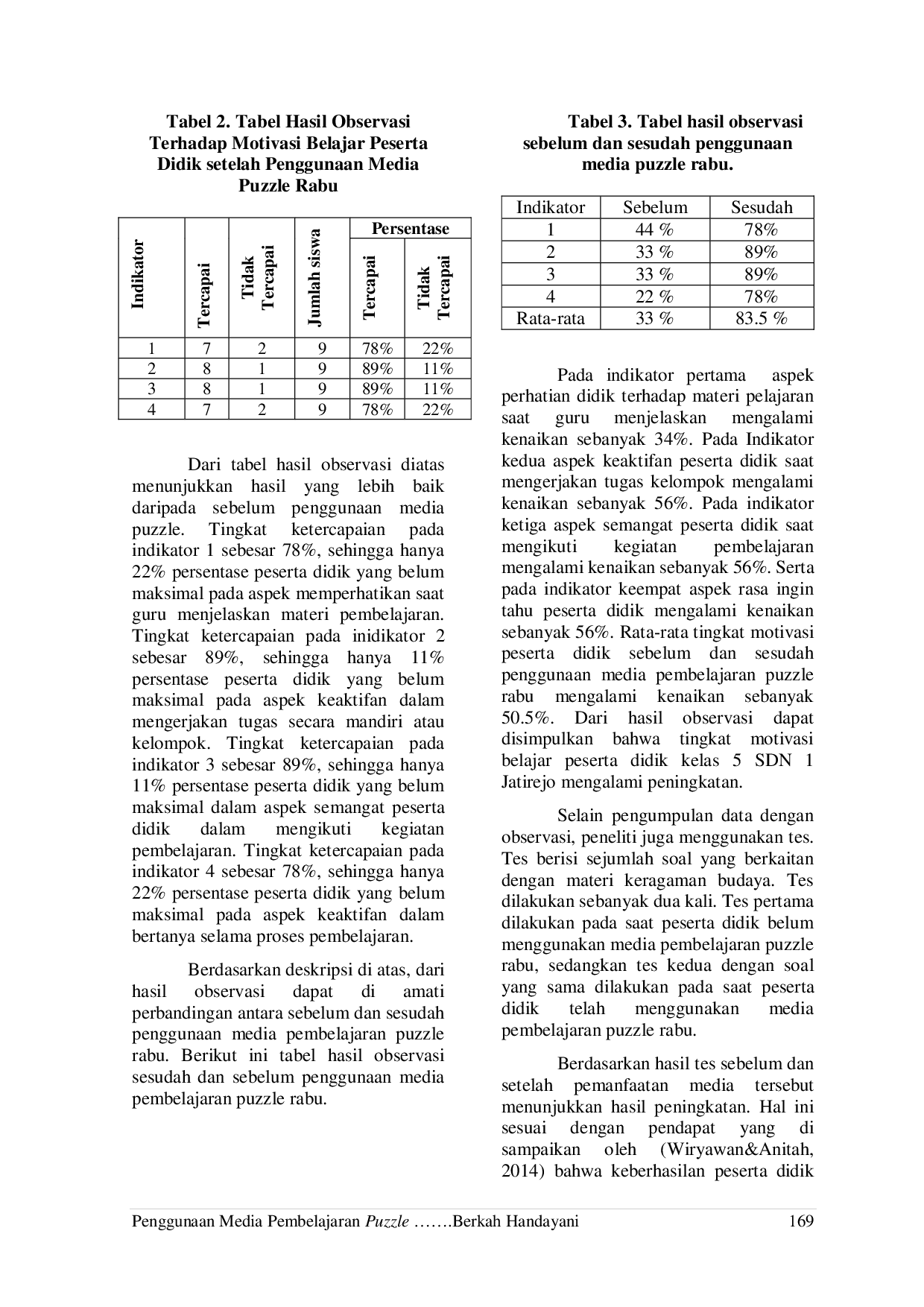 Penggunaan media pembelajaran Puzzle Rabu secara signifikan meningkatkan motivasi belajar peserta didik dari 33 % menjadi 83,5 % serta meningkatkan hasil belajar rata‑rata dari 55 menjadi 84,44.Penelitian ini menunjukkan bahwa media puzzle yang interaktif dan berbasis gambar keragaman budaya mampu memicu rasa ingin tahu, keaktifan, dan semangat belajar, sehingga dapat diterapkan sebagai strategi meningkatkan motivasi dan hasil belajar di mata pelajaran Pendidikan Pancasila.