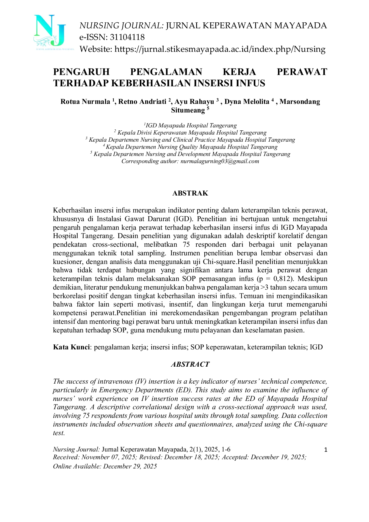 Nursing Journal: Jurnal Keperawatan MayapadaNursing Journal: Jurnal Keperawatan MayapadaKeberhasilan insersi infus merupakan indikator penting dalam keterampilan teknis perawat, khususnya di Instalasi Gawat Darurat (IGD). Penelitian ini bertujuan untuk mengetahui di IGD Mayapada Hospital Tangerang. Desain penelitian yang digunakan adalah deskriptif korelatif dengan pendekatan cross-sectional, melibatkan 75 responden dari berbagai unit pelayanan menggunakan teknik total sampling. Instrumen penelitian berupa lembar observasi dan kuesioner, dengan analisis data menggunakan uji Chi-square. Hasil penelitian menunjukkan bahwa tidak terdapat hubungan yang signifikan antara lama kerja perawat dengan keterampilan teknis dalam melaksanakan SOP pemasangan infus (p = 0,812). Meskipun demikian, literatur pendukung menunjukkan bahwa pengalaman kerja >3 tahun secara umum berkorelasi positif dengan tingkat keberhasilan insersi infus. Temuan ini mengindikasikan bahwa faktor lain seperti motivasi, insentif, dan lingkungan kerja turut memengaruhi kompetensi perawat. Penelitian ini merekomendasikan pengembangan program pelatihan intensif dan mentoring bagi perawat baru untuk meningkatkan keterampilan insersi infus dan kepatuhan terhadap SOP, guna mendukung mutu pelayanan dan keselamatan pasien.