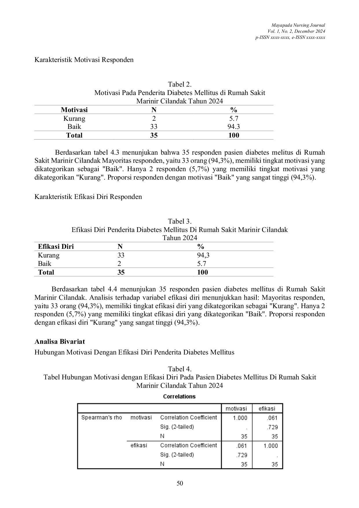 Nursing Journal: Jurnal Keperawatan MayapadaNursing Journal: Jurnal Keperawatan MayapadaPenelitian ini bertujuan mengkaji hubungan antara motivasi dan efikasi diri pada pasien diabetes melitus di Rumah Sakit Marinir Cilandak, mengingat pentingnya pemahaman ini untuk optimalisasi manajemen diri penyakit kronis tersebut. Metodologi yang digunakan adalah studi cross-sectional terhadap 35 pasien diabetes melitus, dengan data motivasi dan efikasi diri dikumpulkan melalui instrumen tervalidasi. Analisis statistik menggunakan uji korelasi Spearmans rho untuk mengevaluasi hubungan antar variabel. Hasil analisis menunjukkan korelasi positif yang sangat lemah (rs = 0,061) dan tidak signifikan (p = 0,729) antara motivasi dan efikasi diri, mengindikasikan tidak adanya hubungan yang berarti antara kedua variabel pada populasi yang diteliti. Kesimpulannya, tidak ditemukan hubungan signifikan antara motivasi dan efikasi diri pada pasien diabetes melitus di Rumah Sakit Marinir Cilandak. Temuan ini menekankan kompleksitas manajemen diabetes dan pentingnya pendekatan holistik dalam perawatan.