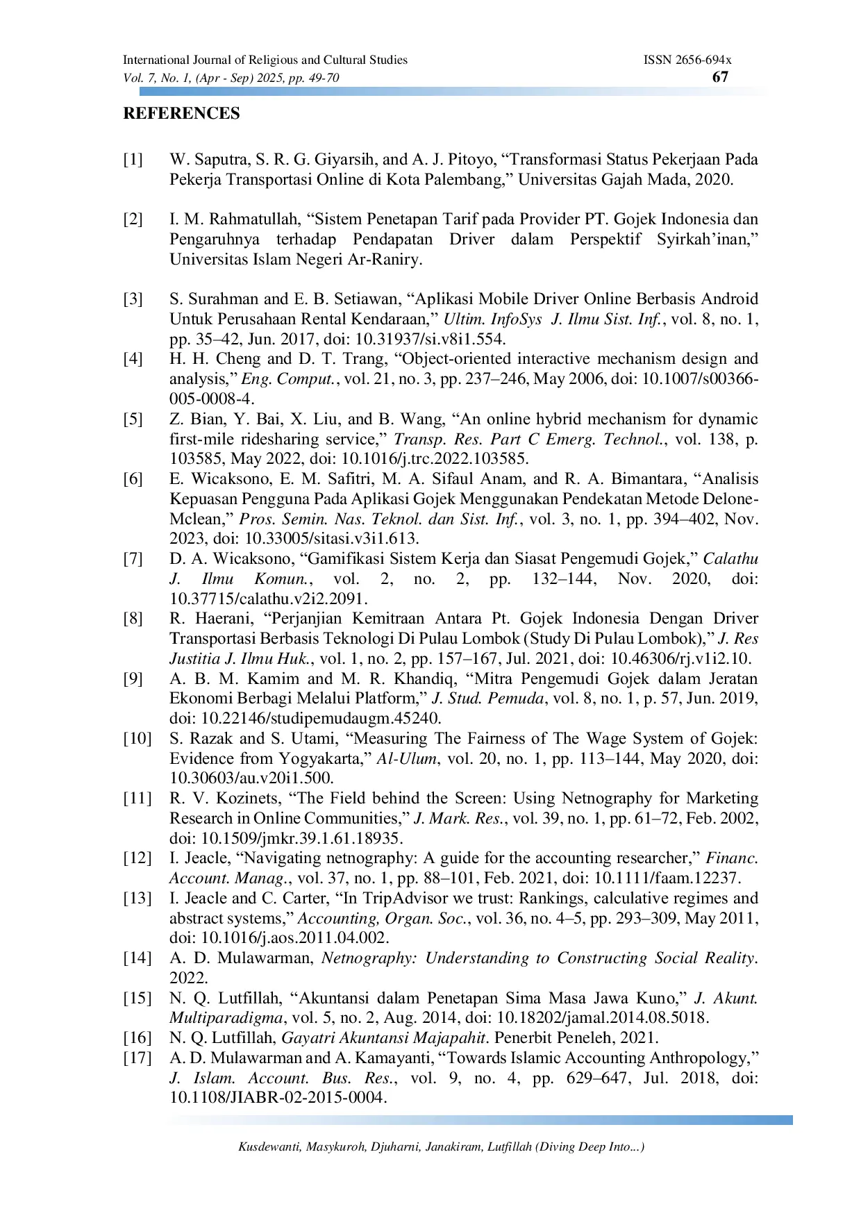 International Journal of Religious and Cultural StudiesInternational Journal of Religious and Cultural StudiesPenelitian ini bertujuan untuk mengungkap realitas biaya transportasi online, sumber konflik utama, dan meneliti struktur sosial serta pola budaya yang membentuk biaya tersebut. Metode netnografi dipakai untuk mengungkap realitas sosial yang dilintasi tarif. Temuan menunjukkan bahwa driver memandang biaya bukan sekadar penghasilan melainkan beban yang memunculkan ketergantungan. Penelitian menyoroti struktur sosial dan budaya yang muncul dari sistem biaya ini dan mengusulkan pendekatan transformatif yang berakar pada nilai lokal guna memecahkan konflik serta meningkatkan kesejahteraan driver.