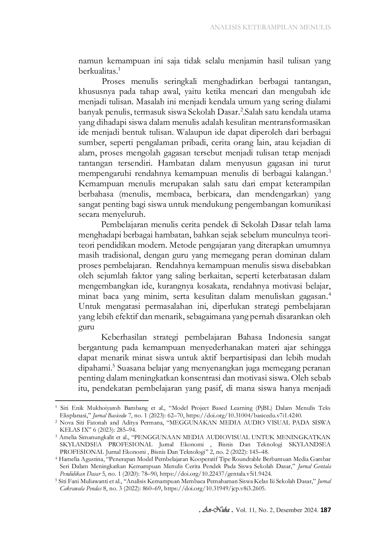 An-Nuha : Jurnal Kajian Islam, Pendidikan, Budaya dan SosialAn-Nuha : Jurnal Kajian Islam, Pendidikan, Budaya dan SosialMenulis merupakan proses mengekspresikan gagasan melalui media tulis, salah satunya cerita pendek, yaitu kisah yang memiliki konflik ringan dan mudah diselesaikan. Penelitian ini bertujuan menganalisis kemampuan menulis cerpen pada siswa kelas fase C di sekolah dasar Dimong 03. Penelitian ini menggunakan pendekatan deskriptif kualitatif. Aspek penilaian yang harus dipahami oleh siswa ada empat, yaitu kelengkapan aspek formal cerpen, kelengkapan unsur intrinsik cerpen, keterpaduan struktur cerpen, dan kesesuaian penggunaan bahasa cerpen. Hasil dari penelitian menunjukkan perbedaan kemampuan menulis antarsiswa. Berdasarkan analisis terhadap empat aspek penilaian, seluruh siswa perhitungan rata-rata nilai (83%), kemampuan menulis cerpen siswa kelas V SDN Dimong 03 secara keseluruhan dikategorikan sebagai baik. Penelitian ini menyoroti keragaman kemampuan menulis cerpen di antara siswa dan memberikan gambaran mengenai tingkat penguasaan keterampilan menulis cerpen pada siswa tersebut. Penelitian mengenai analisis keterampilan menulis cerpen memiliki banyak manfaat dalam pembelajaran Bahasa Indonesia. Hal itu disebabkan karena menulis cerpen dapat mengembangkan kemampuan berbahasa siswa, terutama dalam hal menyusun kalimat, memilih kata yang tepat, dan mengorganisasi ide. Kegiatan ini juga mendorong kreativitas berimajinasi dan menyampaikan ide-ide dalam bentuk cerita. Selain itu, menulis cerpen membantu siswa belajar menggunakan kata-kata yang tepat dan efektif.