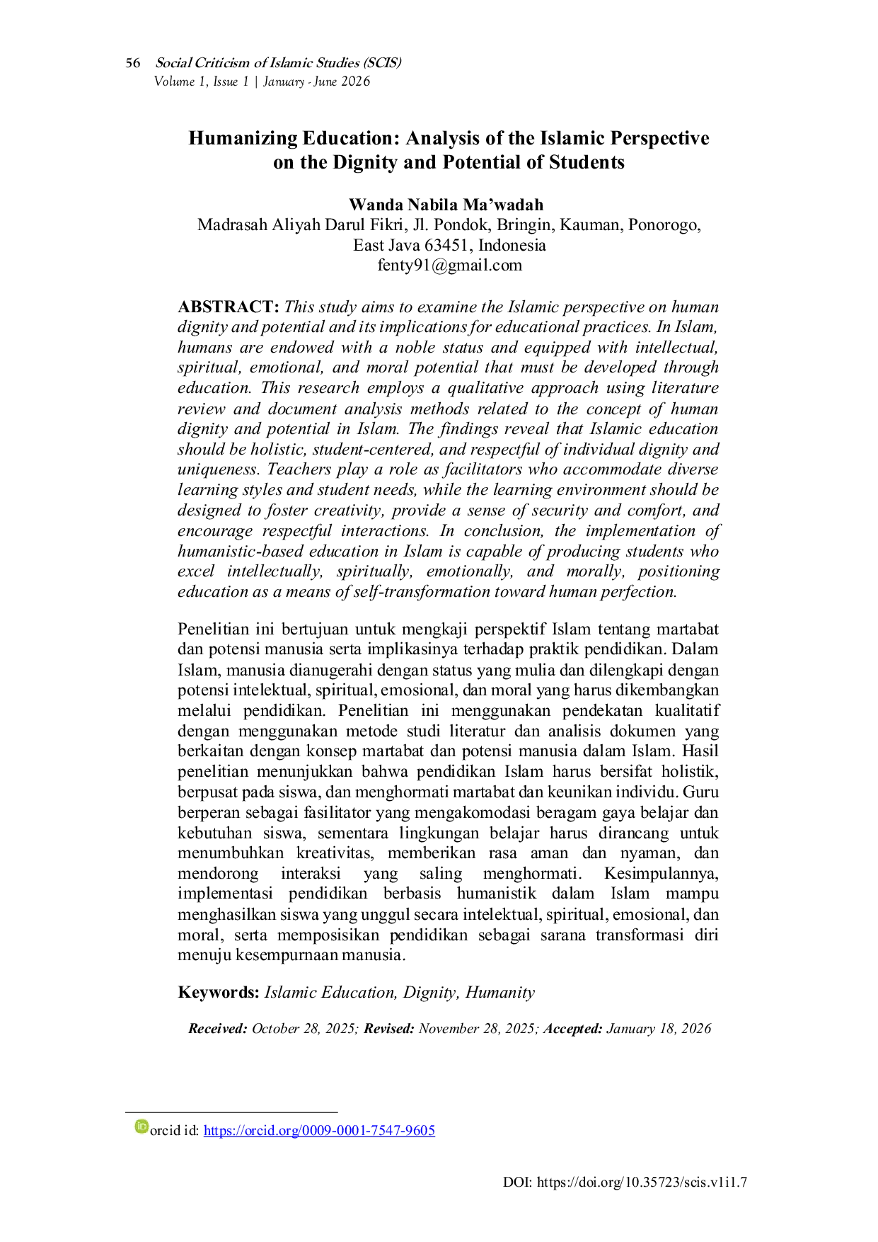 Social Criticism of Islamic StudiesSocial Criticism of Islamic StudiesPenelitian ini bertujuan untuk mengkaji perspektif Islam tentang martabat dan potensi manusia serta implikasinya terhadap praktik pendidikan. Dalam Islam, manusia dianugerahi dengan status yang mulia dan dilengkapi dengan potensi intelektual, spiritual, emosional, dan moral yang harus dikembangkan melalui pendidikan. Penelitian ini menggunakan pendekatan kualitatif dengan menggunakan metode studi literatur dan analisis dokumen yang berkaitan dengan konsep martabat dan potensi manusia dalam Islam. Hasil penelitian menunjukkan bahwa pendidikan Islam harus bersifat holistik, berpusat pada siswa, dan menghormati martabat serta keunikan individu. Guru berperan sebagai fasilitator yang mengakomodasi beragam gaya belajar dan kebutuhan siswa, sementara lingkungan belajar harus dirancang untuk menumbuhkan kreativitas, memberikan rasa aman dan nyaman, serta mendorong saling menghormati. Kesimpulannya, implementasi pendidikan berbasis humanistik dalam Islam mampu menghasilkan siswa yang unggul secara intelektual, spiritual, emosional, dan moral, serta memposisikan pendidikan sebagai sarana transformasi diri menuju kesempurnaan manusia.