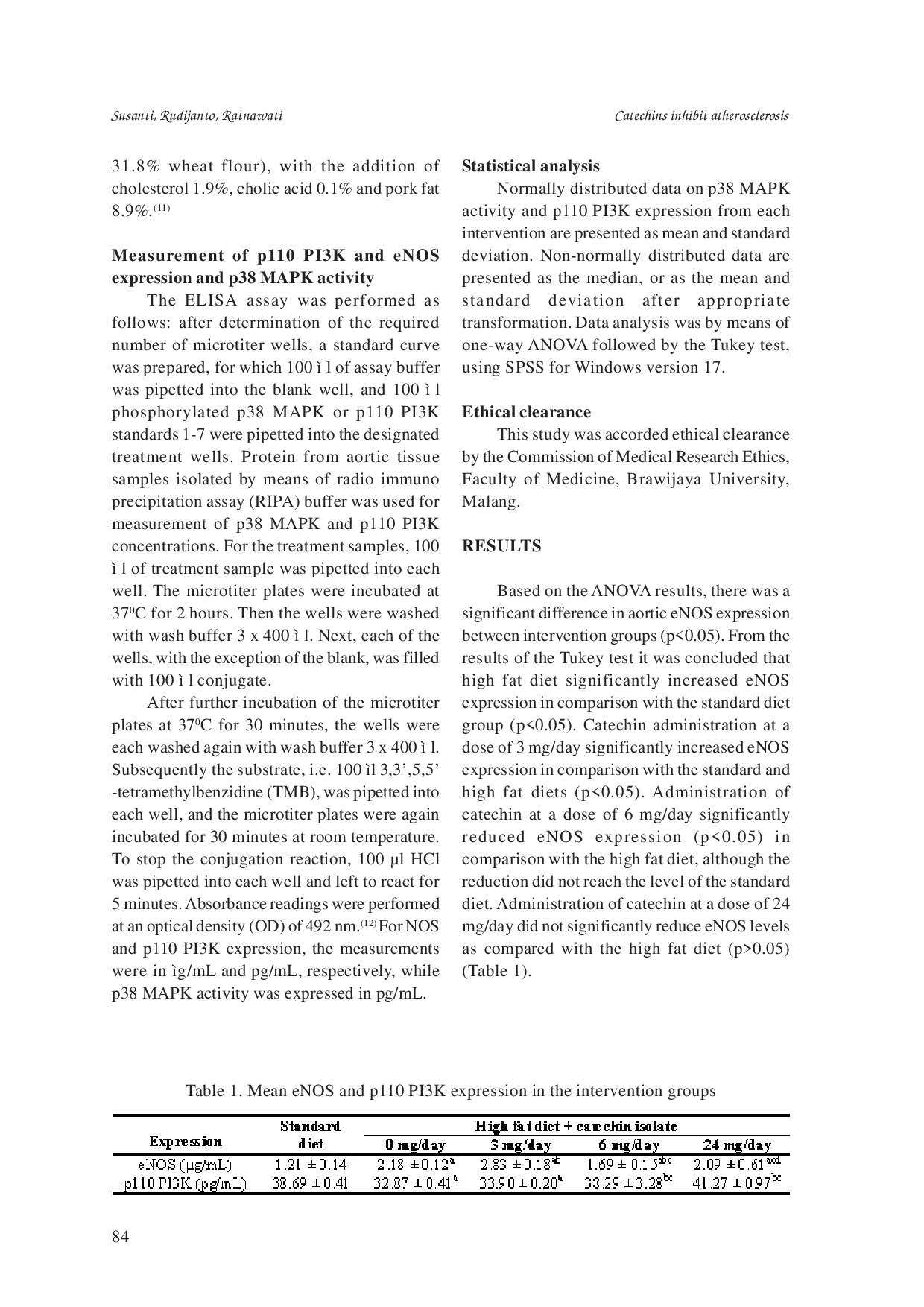 Diet tinggi lemak meningkatkan ekspresi eNOS, menurunkan ekspresi PI3K, dan meningkatan ekspresi p38 MAPK.Pemberian katekin dapat menurunkan ekspresi eNOS, meningkatkan ekspresi PI3K, dan menurunkan aktivitas p38 MAPK.