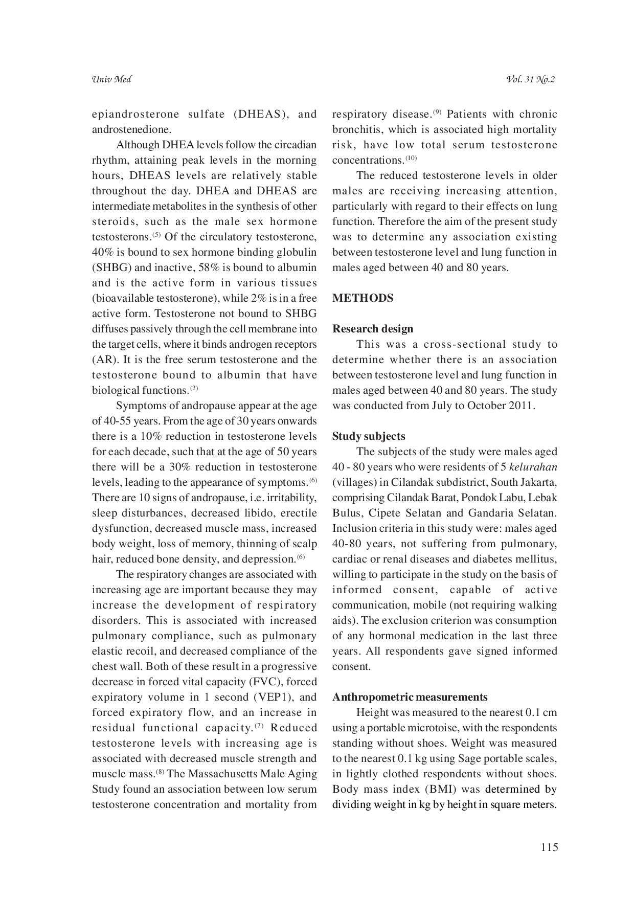 Universa MedicinaUniversa MedicinaPeningkatan usia dan penurunan kadar hormon testosteron pada laki-laki akan mempengaruhi kekuatan dan massa otot terutama otot rangka. Penurunan fungsi paru akibat pengurangan massa dan kekuatan otot pernapasan belum banyak diketahui. Penelitian ini bertujuan untuk menentukan hubungan antara indeks testosteron dan fungsi paru pada laki-laki berusia antara 40 sampai 80 tahun. Penelitian ini menggunakan desain potong lintang mengikut sertakan 167 laki-laki yang berusia antara 40 sampai 80 tahun di Kecamatan Cilandak Jakarta Selatan. Pemeriksaan kadar testosteron total dilakukan dengan electrochemiluminescence immunoassay (Eclia) dengan Roche Elecsys Reagen Kit Cat 11776061. Sex hormone-binding globulin (SHBG) diukur dengan metode Eclia dengan reagen elecsys 2010 (Calos e601). Indeks testosteron bebas (ITB) dihitung berdasarkan kadar testosteron bebas/SHBG x 100%. Volume ekspirasi paksa satu detik pertama (VEP1) diperiksa dengan memakai spirometer AS 500. Usia rata-rata subjek adalah 53,32 ± 8,26 tahun, kadar testosteron total serum rata-rata adalah 532,59 ± 206,92 ng/dL, kadar SHBG rata-rata adalah 41,26 ± 21,14 nmol/L, nilai ITB rata-rata adalah 48,22 ± 14,34 %, dan VEP1 rata-rata adalah 1,63 ± 0,54 L. Terdapat hubungan bermakna antara kadar SHBG dan ITB dengan VEP1 dengan koefisien korelasi Pearson masing-masing sebesar -0,199 (p=0,010) dan 0,271 (p=0,000). Analisis regresi ganda linier menunjukkan ITB yang paling berpengaruh terhadap fungsi paru (VEP1), semakin tinggi nilai ITB semakin tinggi VEP1 (â=0,008: p=0,004).