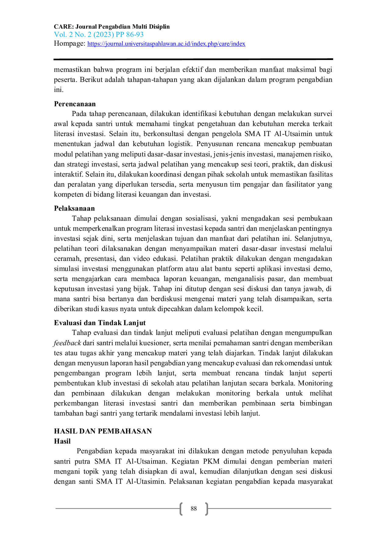 CARE: Journal Pengabdian Multi DisiplinCARE: Journal Pengabdian Multi DisiplinPengetahuan tentang investasi menjadi semakin penting untuk memastikan kesiapan finansial masa depan. Penelitian ini berfokus pada pemahaman santri terhadap konsep investasi, alat-alat investasi yang tersedia, dan risiko yang terkait dengan investasi. Melalui metode pengabdian masyarakat dalam bentuk penyuluhan dan sosialisasi mengenai literasi investasi di kalangan santri diharapkan mampu untuk meningkatkan pengetahuan dan minat santri dalam melakukan investasi di masa depan. Selain itu, kurangnya sumber daya pendidikan dan panduan praktis di sekolah juga menjadi hambatan utama. Oleh karena itu, pengabdian ini merekomendasikan peningkatan kurikulum pendidikan yang mencakup literasi finansial dan investasi, serta pelatihan bagi guru untuk membimbing santri dalam membuat keputusan investasi yang bijak. Dengan meningkatkan literasi investasi, diharapkan santri dapat lebih siap menghadapi tantangan ekonomi masa depan dan mengembangkan kebiasaan keuangan yang sehat sejak dini.