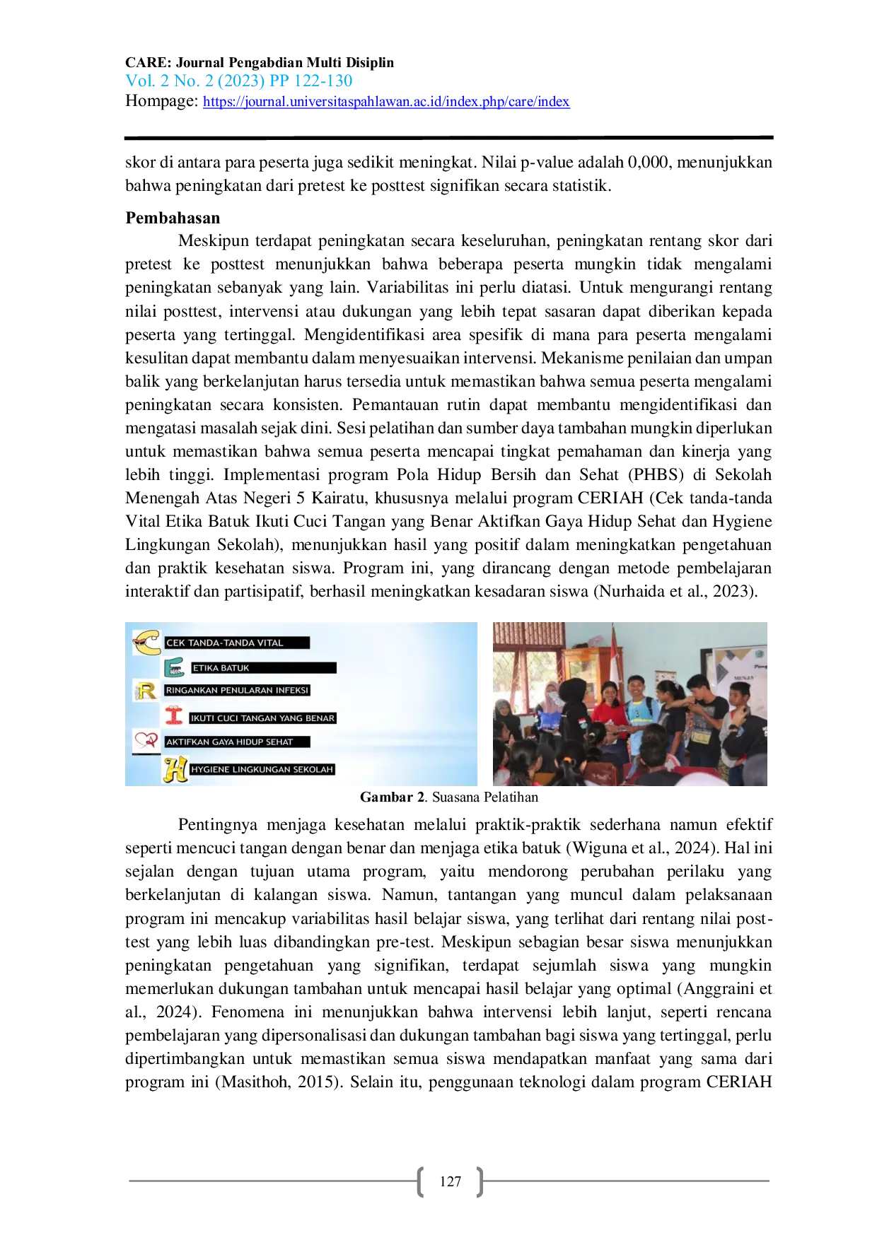 CARE: Journal Pengabdian Multi DisiplinCARE: Journal Pengabdian Multi DisiplinArtikel ini membahas pentingnya penerapan program Pola Hidup Bersih dan Sehat (PHBS) di lingkungan sekolah, dengan fokus khusus pada program CERIAH (Cek tanda-tanda Vital, Etika Batuk, Ikuti Cuci Tangan yang Benar, Aktifkan Gaya Hidup Sehat, dan Hygiene Lingkungan Sekolah) di Sekolah Menengah Atas Negeri 5 Kairatu. Program ini bertujuan untuk meningkatkan kesadaran dan pengetahuan kesehatan di kalangan siswa dengan metode pembelajaran yang interaktif dan partisipatif. Hasil dari penelitian ini menunjukkan peningkatan yang signifikan dalam pengetahuan dan praktik siswa mengenai kesehatan dan kebersihan setelah mengikuti program ini. Selain itu, artikel ini juga mengeksplorasi tantangan yang dihadapi dalam pelaksanaan program serta rekomendasi untuk perbaikan di masa depan. Penggunaan teknologi dalam memperluas dampak program juga dibahas sebagai langkah strategis untuk memastikan keberlanjutan dan efektivitas jangka panjang.