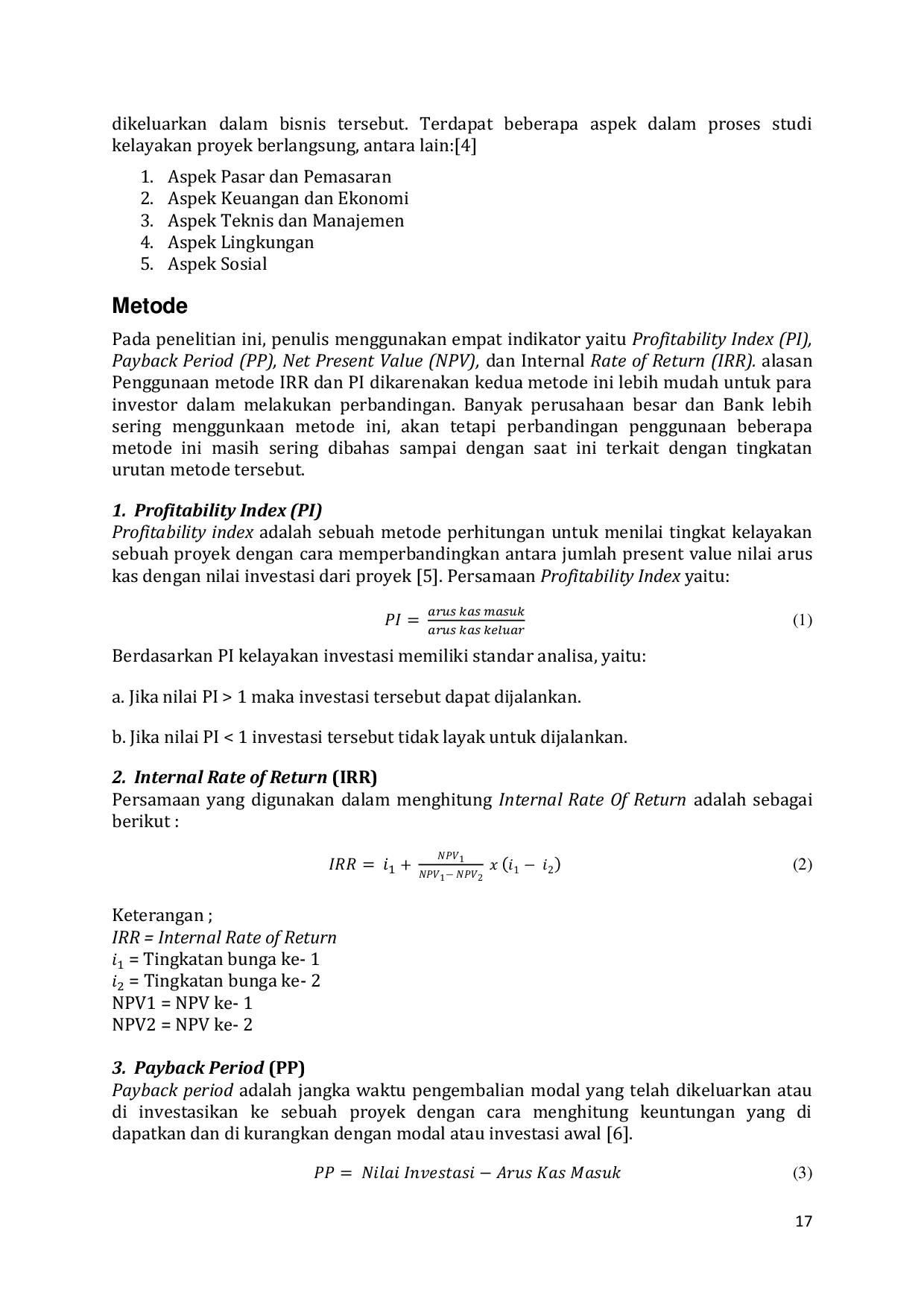 Jurnal Aspirasi Teknik SipilJurnal Aspirasi Teknik SipilAnalisa studi kelayakan pada proyek bertujuan sebagai langkah awal dimana para investor atau penanam modal untuk mendapatkan gambaran pada proyek yang nantinya akan dilaksanakan. Pada tahap akhir dari analisa ini akan menentukan proyek tersebut layak atau tidaknya untuk dijalankan. Tahapan awal adalah tahap pengumpulan data yang penulis perlukan untuk mempermudah proses analisa. Adapun data yang diperlukan meliputi Siteplan, data gambar, Rancangan Anggaran Biaya (RAB). Kemudian penulis menganalisa dengan menggunakan empat indiaktor yaitu Internal Rate of Return (IRR) dan Profitability Index (PI), Payback Period (PP), Net Present Value (NPV). Dari hasil analisa yang penulis peroleh, mendapatkan kesimpulan bahwa proyek pembangunan Ruko Papa Mama Residence dinyatakan layak untuk dijalankan. Dengan estimasi pengembalian dana selama dua tahun dan hasil yang didapatkan dari IRR menunjukan angka 28,2%, NPV menunjukan angka positif, dan PI menunjukan angka 1,38 di atas angka 1. Adapun kentungan bersih yang didapat sebesar Rp. 9.631.370.622,-. Maka proyek tersebut layak untuk dijalankan.